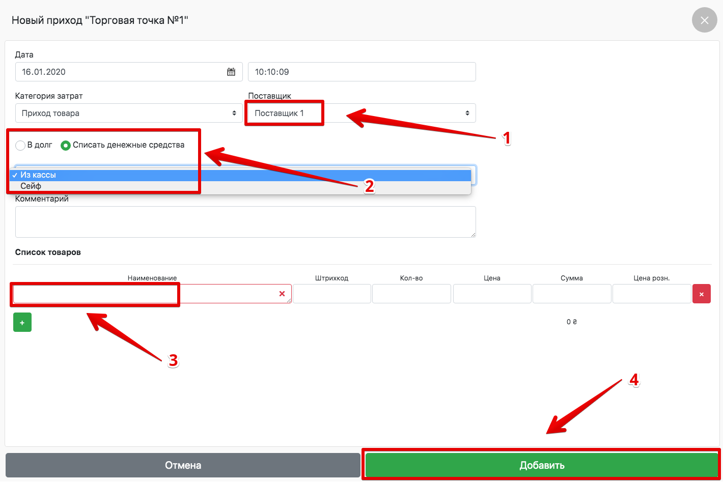 - На панэлі адміністратара перайдзіце ў раздзел ” Першапачатковы ” , абярыце патрэбную гандлёвую кропку (калі ў вас іх некалькі) і націсніце ” Прыбыццё тавараў”.