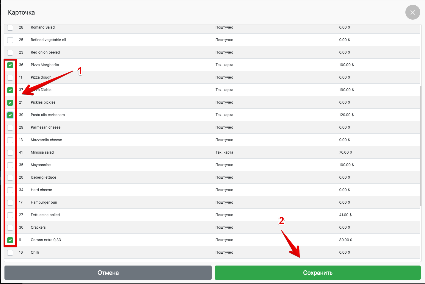- Адзначаеце тавары і націскаеце Захаваць