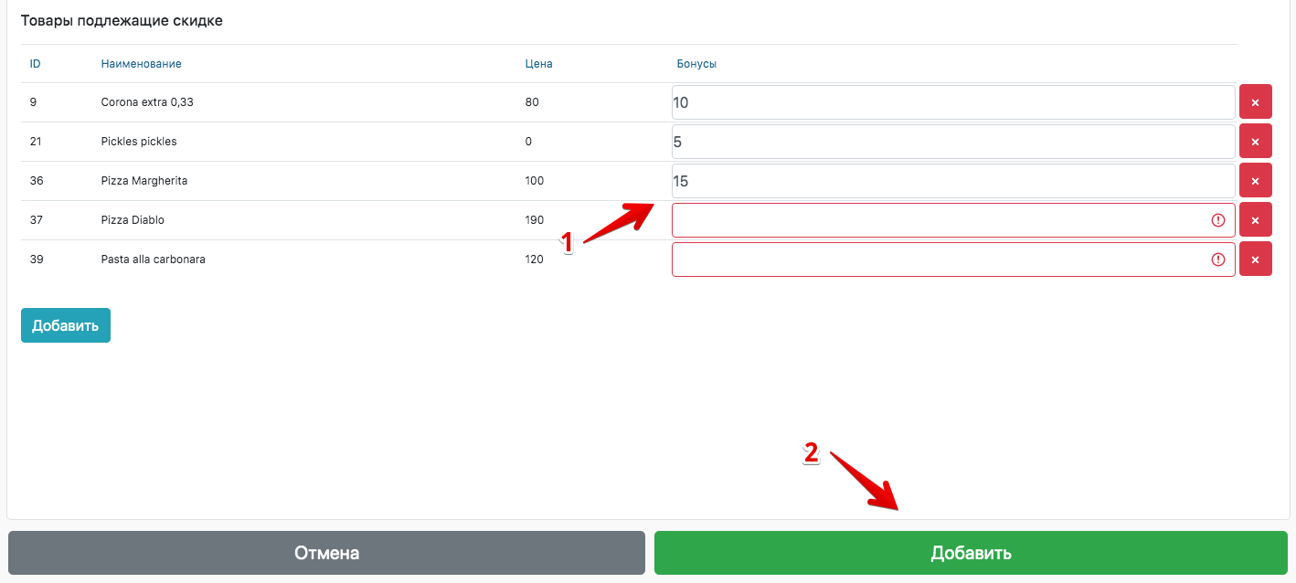 - У табліцы выбраных тавараў запоўніце калонку Бонусы (колькасць бонусаў якая паступiць на баланс кліента, пры куплі гэтага тавару)