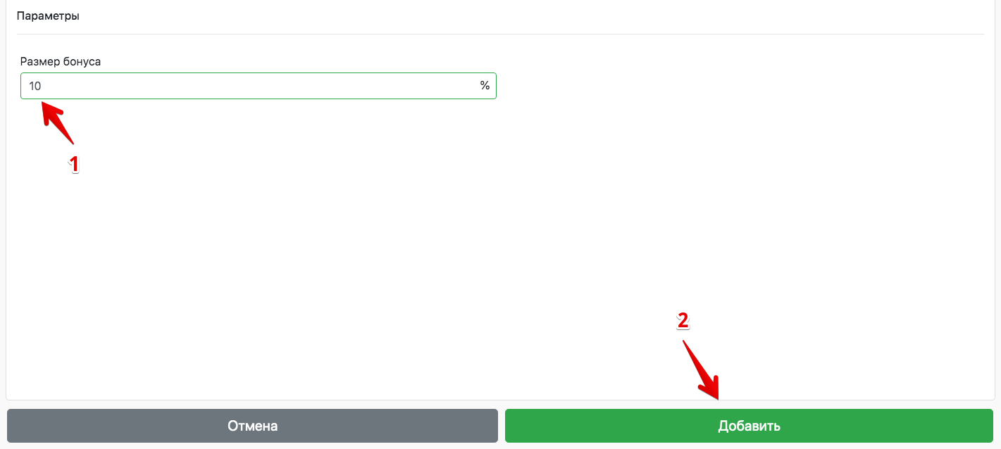 - У блоку ” Параметры ” у поле Памер бонуса увядзіце працэнт бонуса (гэты адсотак ад чэка атрымае кліент на свой бонусны баланс)