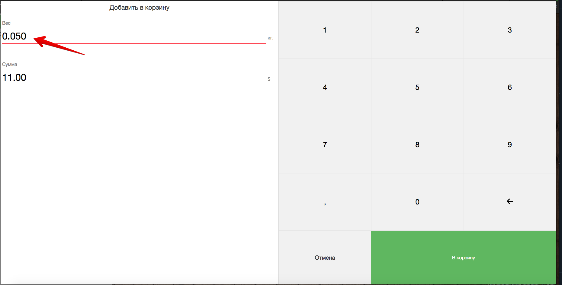 Даданне ўзважанага прадукту