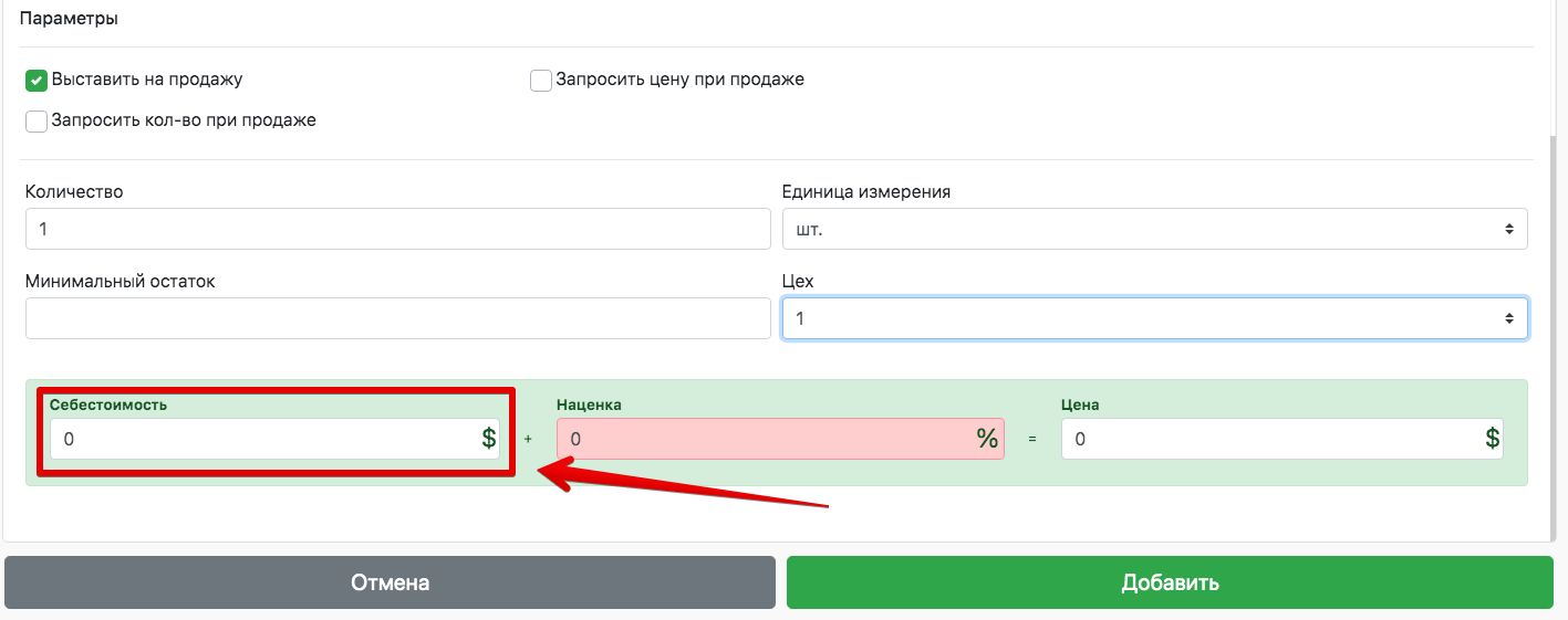 - Пасля запаўнення ўсіх палёў унізе карты ў блоку Параметры адрэдагуйце кошт сабекошту