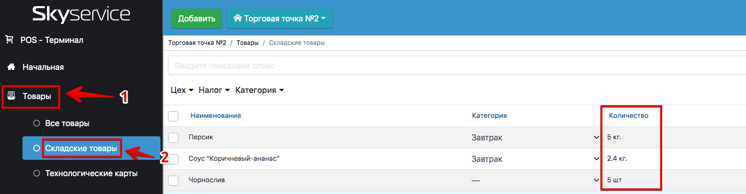 На панэлі адміністратара перайдзіце ў раздзел Прадукты – Складскія тавары