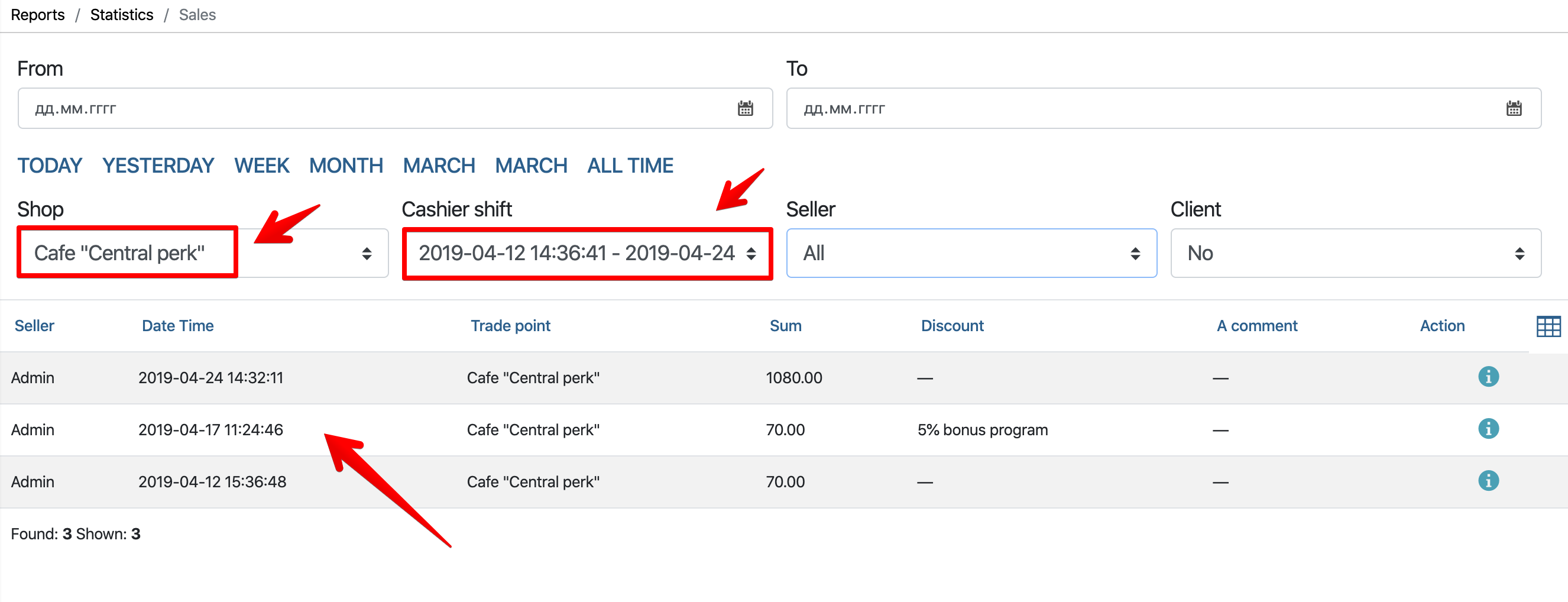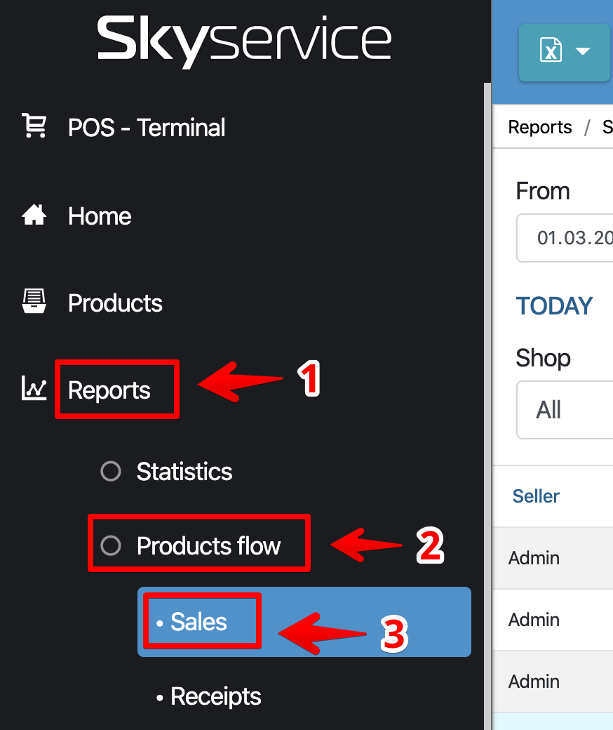 - Gehen Sie zum Admin-Panel: „ Berichte “ – „ Warenbewegungen “ – „ Verkäufe “