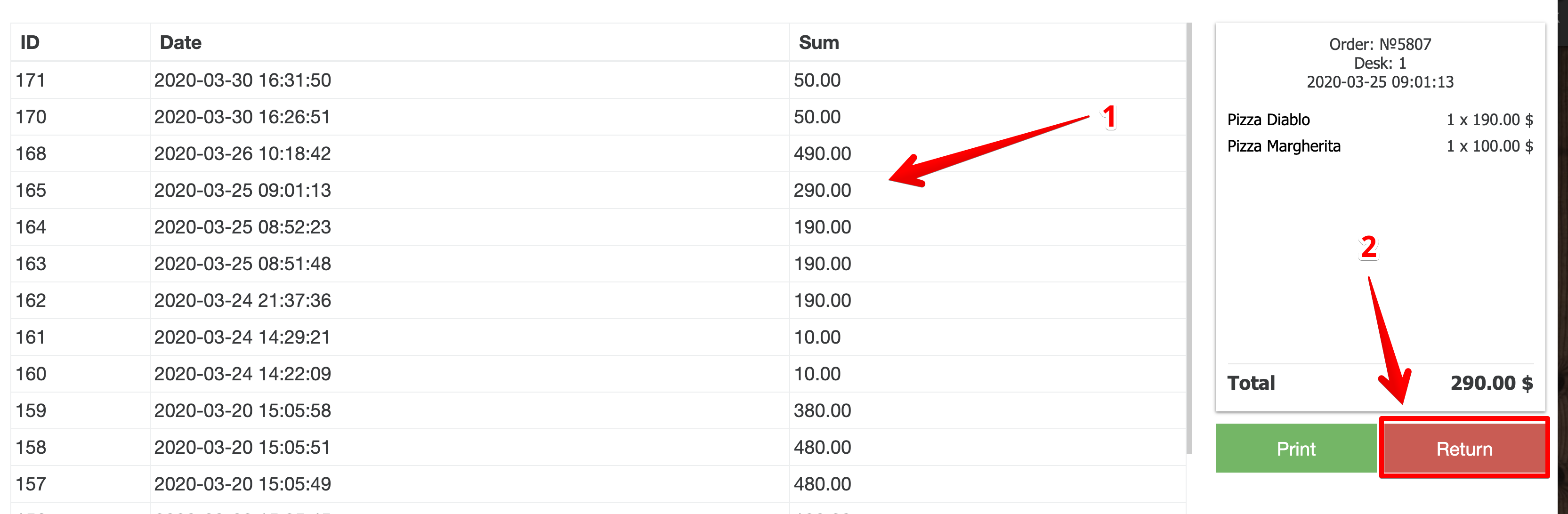 - Wir gehen zum POS-Terminal: „Kasse“ – „Verkaufshistorie“