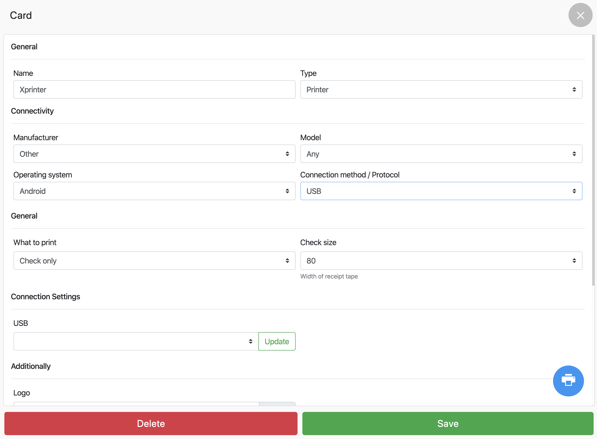 - Valige kviitungi soovitud laius (sõltub printerist). Lisage logo , klõpsates suure sinise plussnupuga (png-failivorming) nuppu