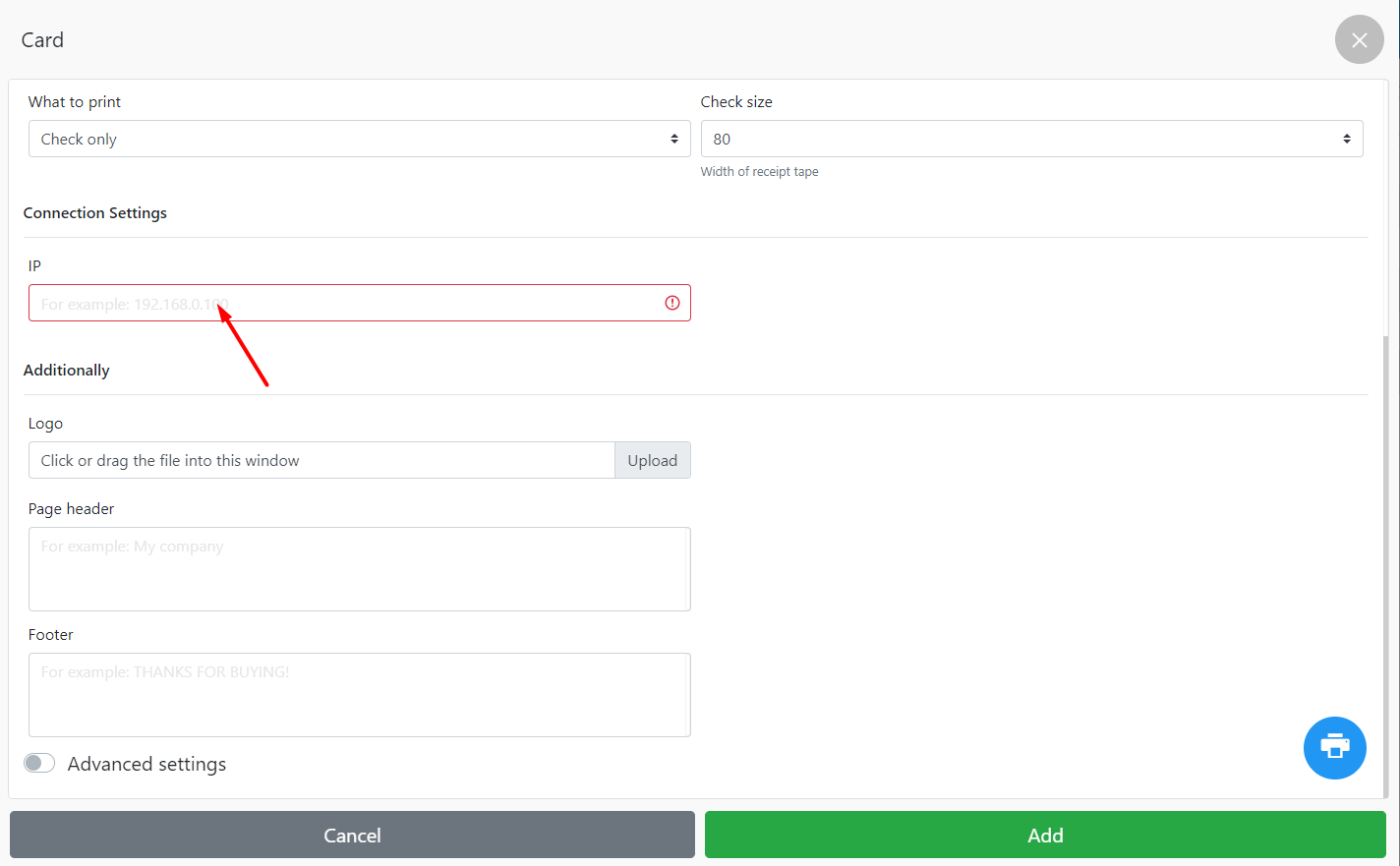 - Savo logotipą galite įkelti į kvitą spustelėdami mygtuką „Įkelti“ (susisiekite su gamintoju dėl logotipo spausdinimo palaikymo)