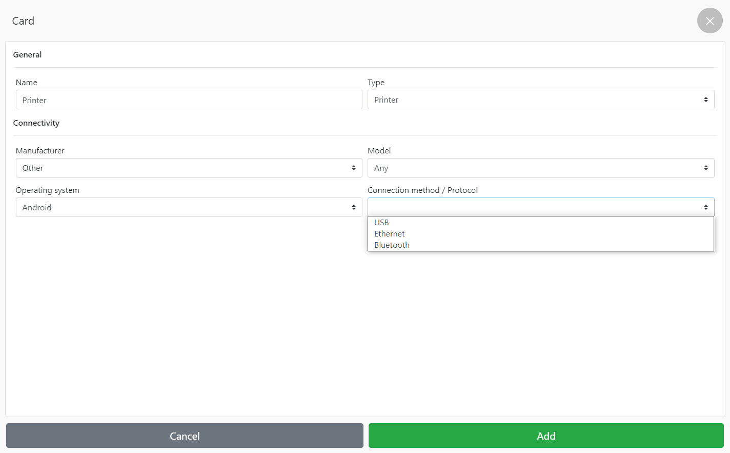 - Prisijungimo būdas – pasirinkite vieną iš būdų USB / Ethernet / Bluetooth