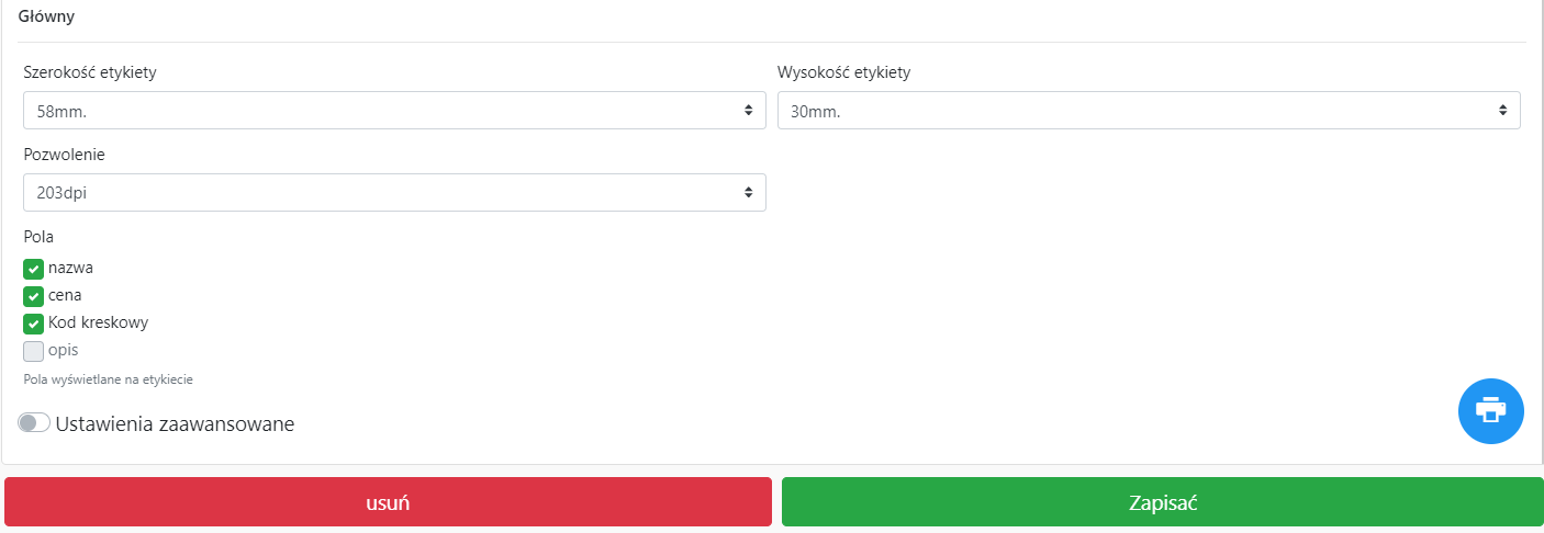 - Wybierz pola, które będą widać się na etykiecie – Nazwa, cena, kod kreskowy, *opis