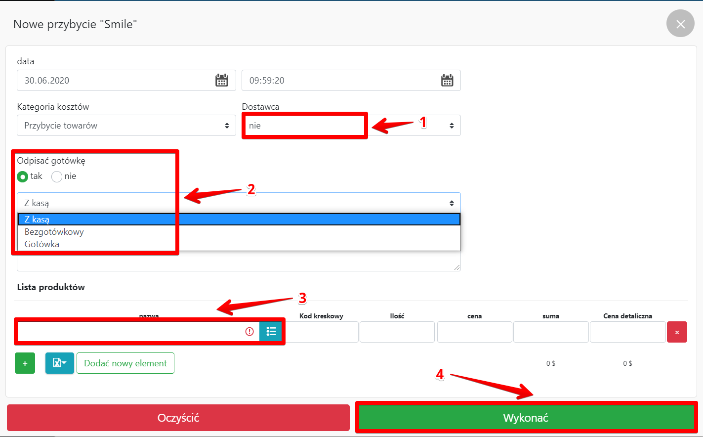 • Wybierz metodę płatności dostawcy (na kredyt , z kasy lub z utworzonego konta )