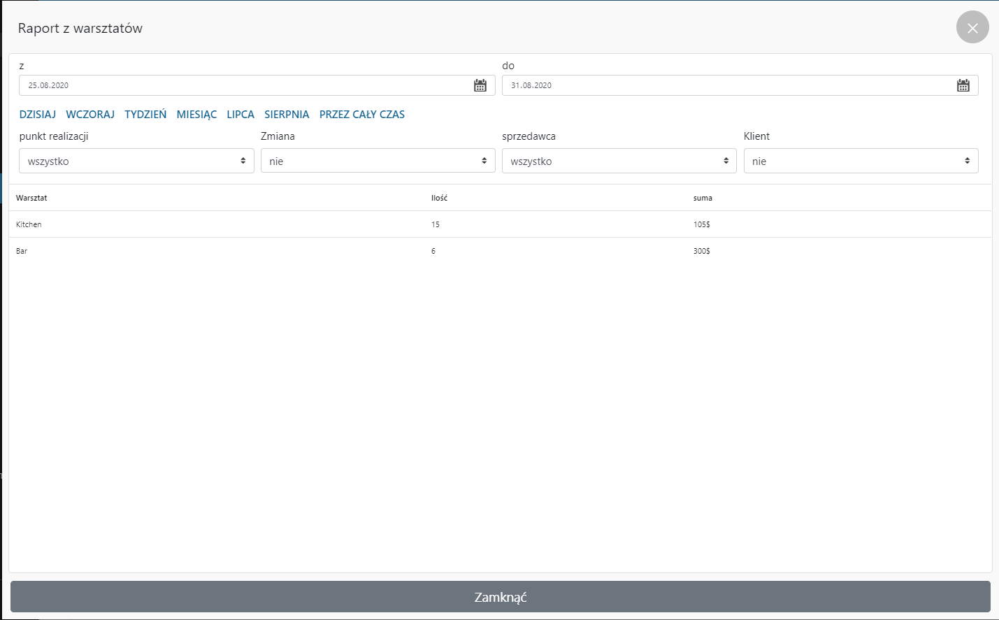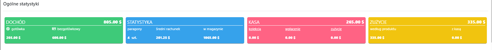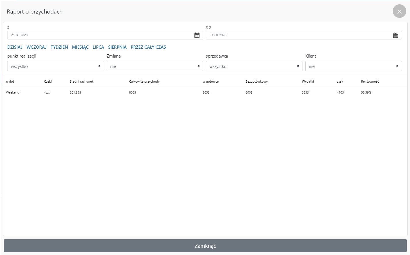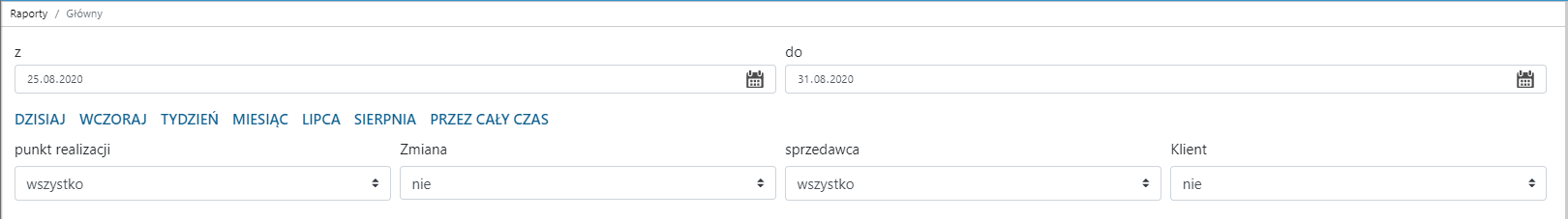 - paragony – ilość zaksięgowanych paragonów za wybrany okres / zmianę;