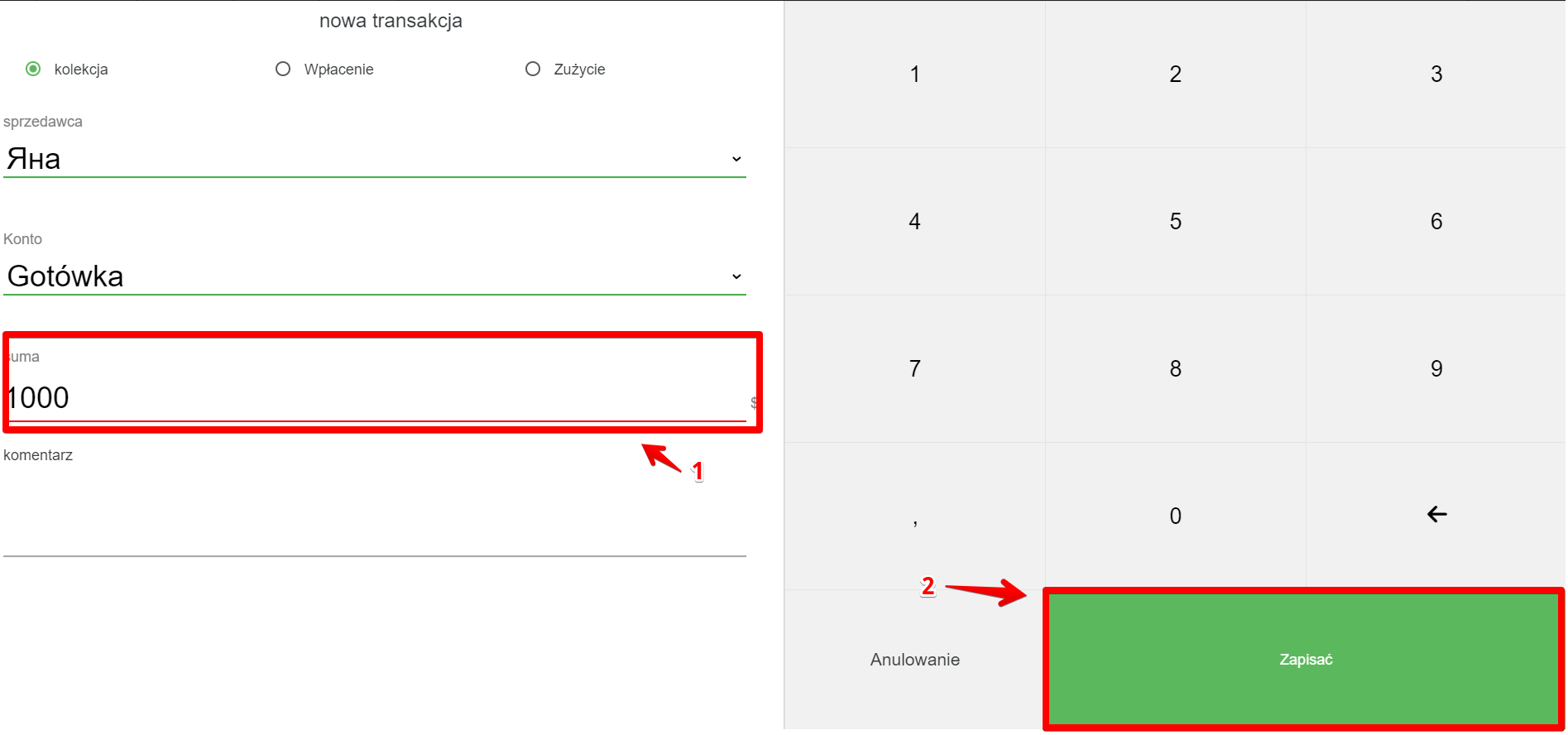 - Wprowadź żądaną kwotę gotówki i kliknij Zapisać
