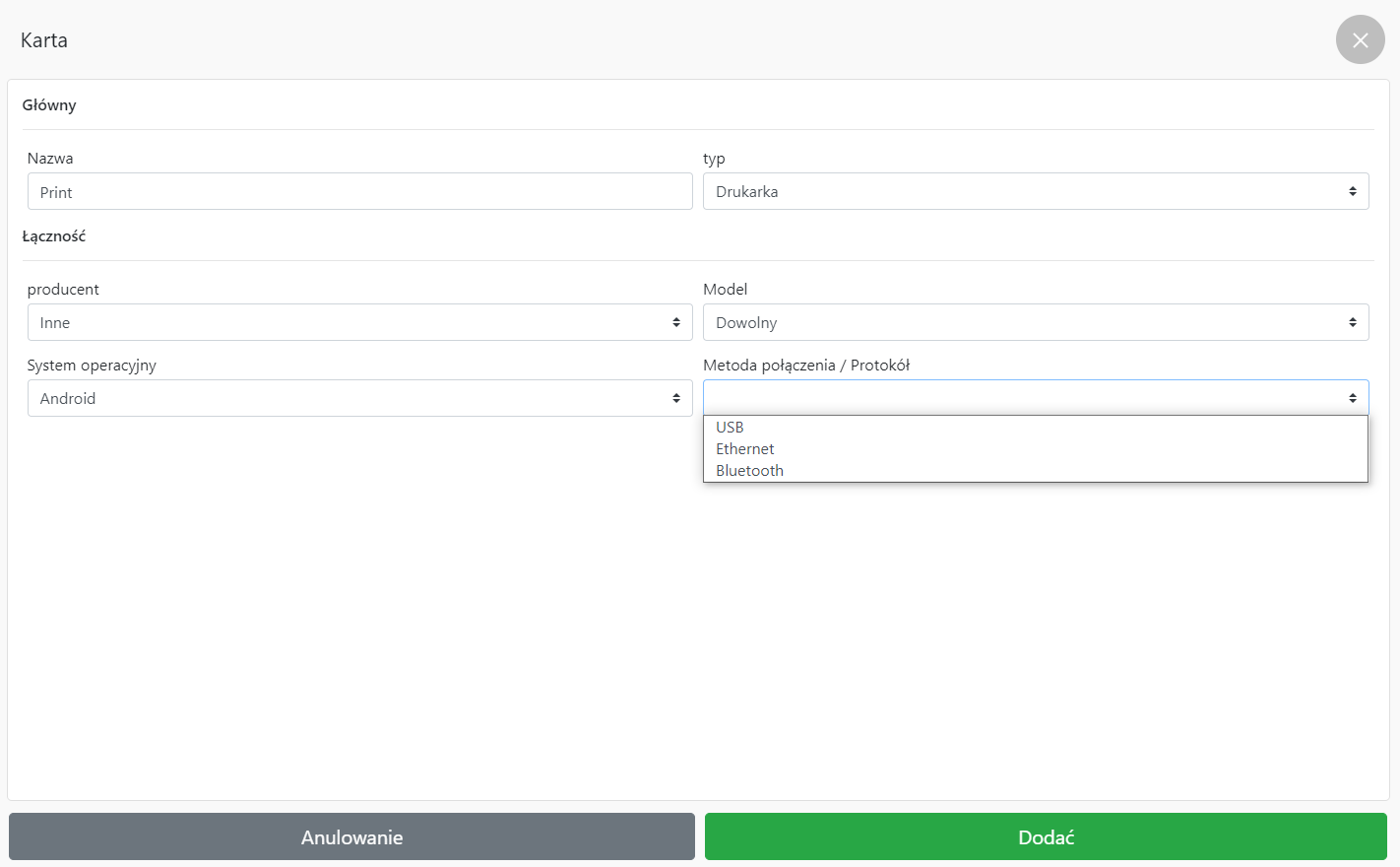 - W bloku “Główny” wybierz sposób połączenia – USB