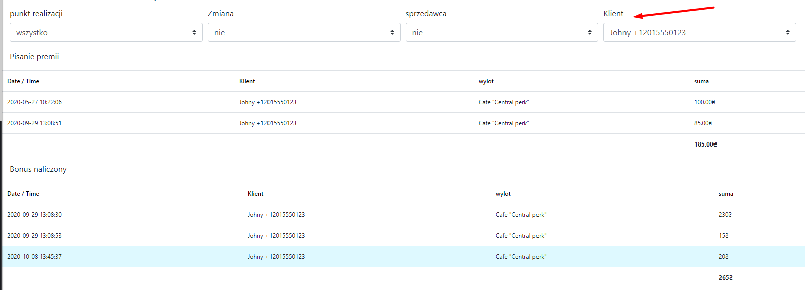 - Aby zaakceptować płatność za pomocą bonusów, wybierz klienta w terminalu POS
