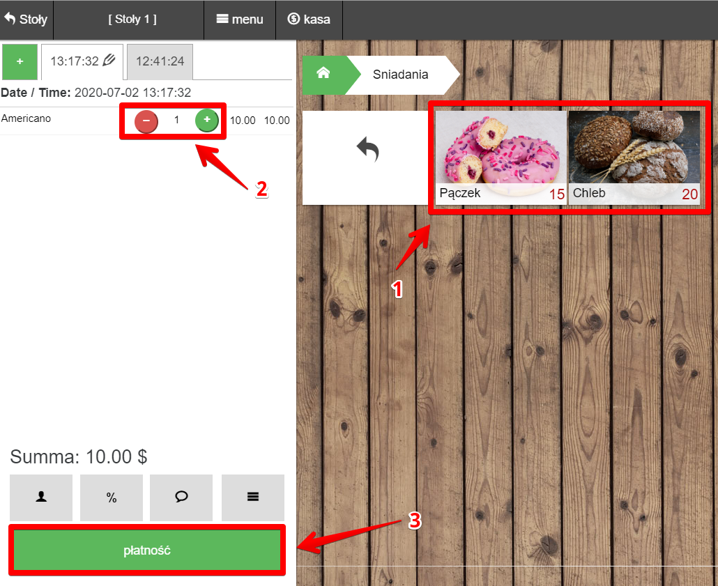 Przy realizacji pierwszej sprzedaży dodaj towary / danie do paragonu na terminalu