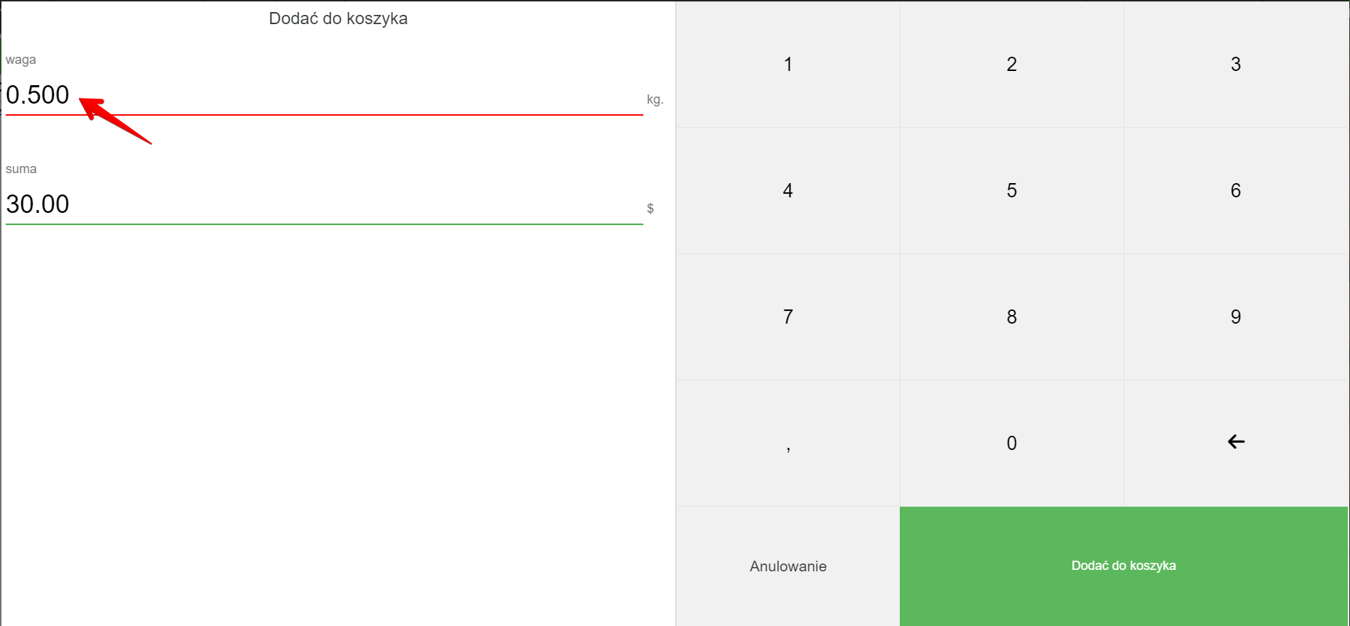 - W wyskakującym oknie wprowadź ilość (wagę)