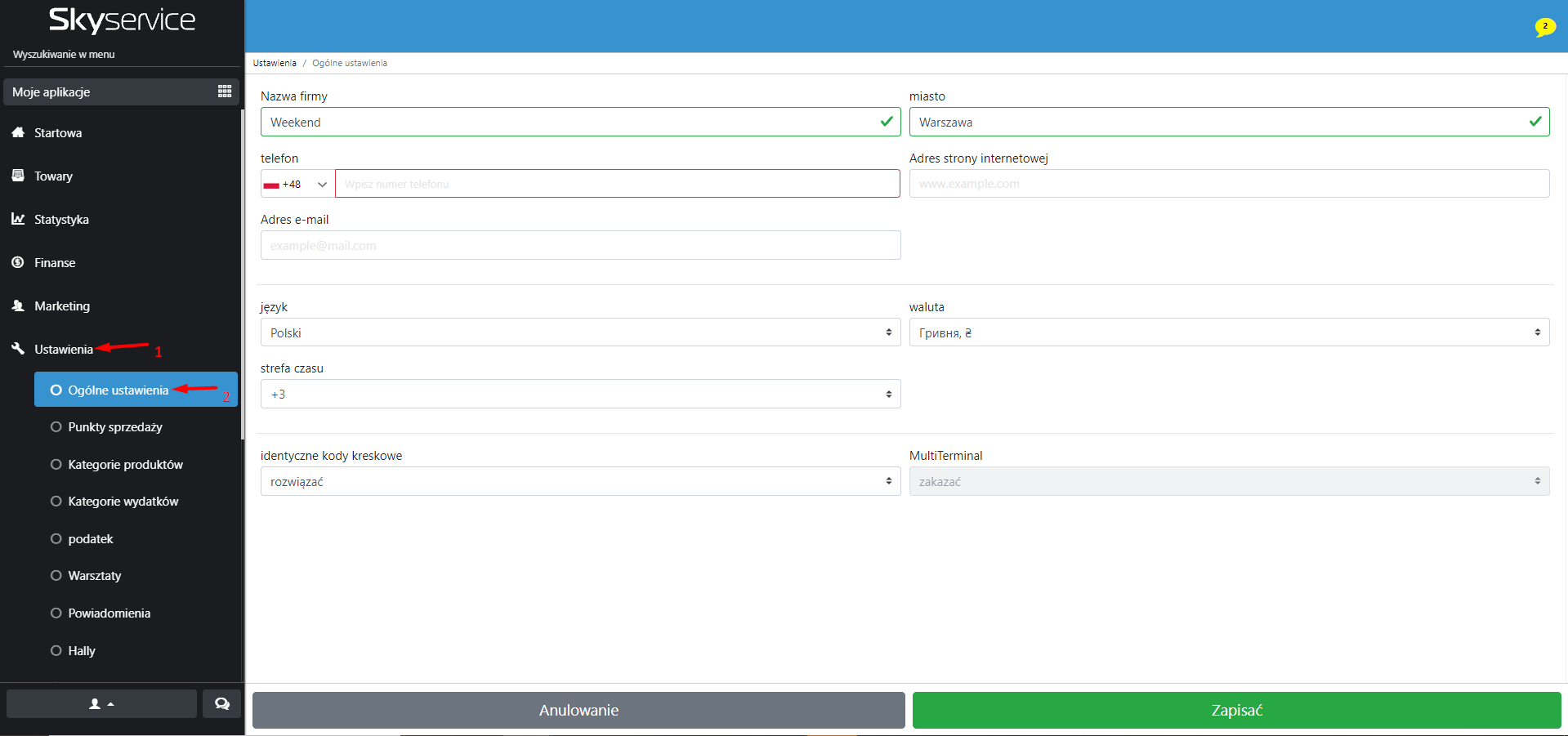 Ustawiamy główne parametry działalnośći firmy: nazwę, walutę, strefę czasową, adres strony internetowej itp. (Ten element jest opcjonalny, ale ma sens dla wygodniej nawigacji w programie), aby uzyskać szczegółowy opis, kliknij