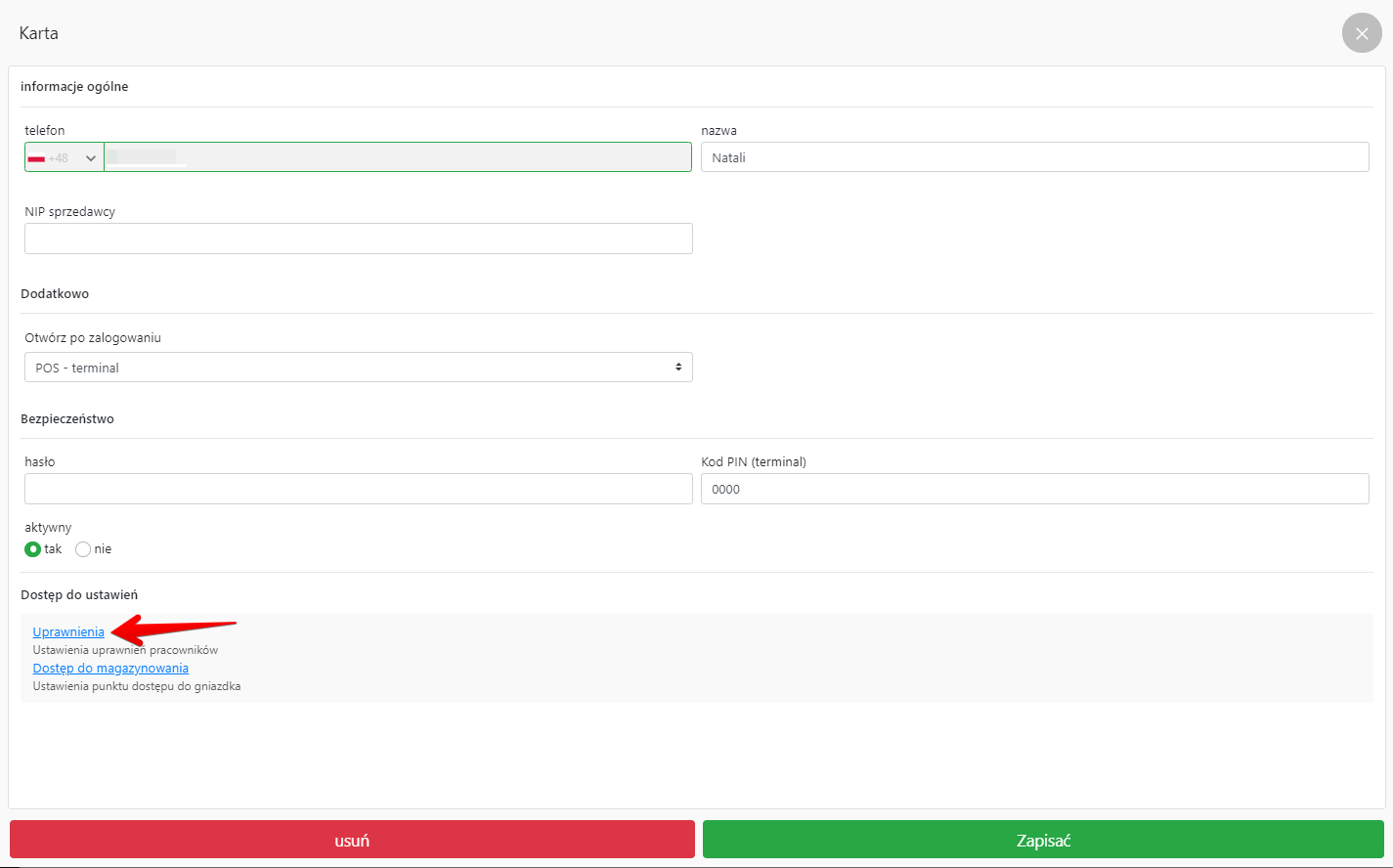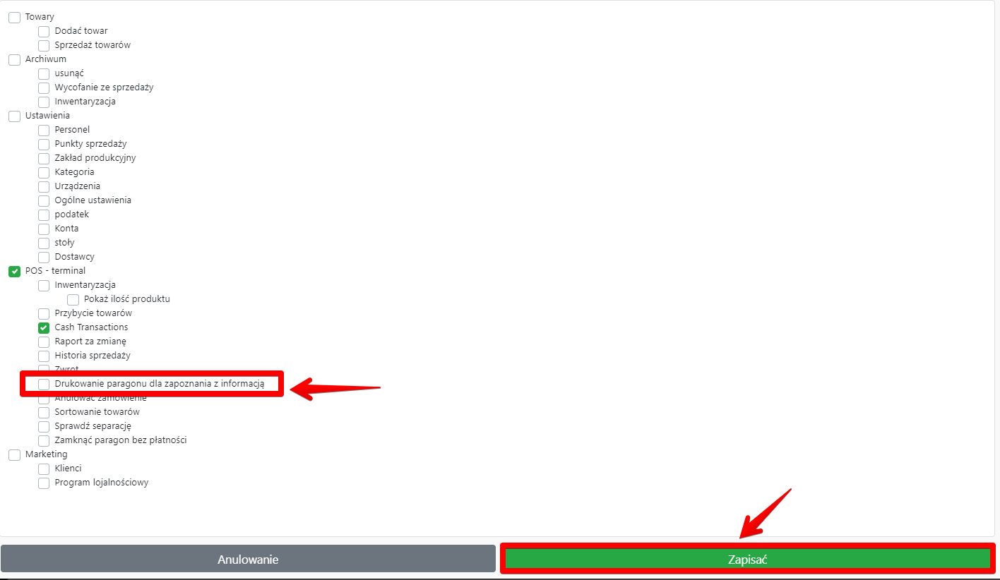 - W oknie Uprawnienia odznacz Drukować paragon wstępny