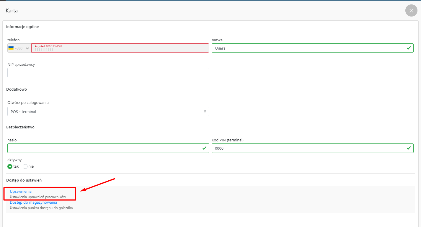 - W karcie Prawa dostępu/Uprawnienia zaznacz opcję „Drukowanie paragonu dla zapoznania z informacją”
