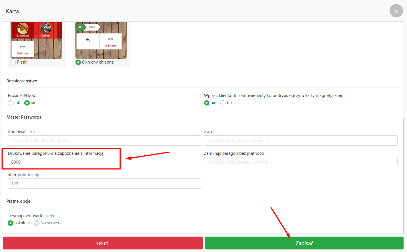 - W bloku Mater passwords, w polu Drukowanie paragonu dla zapoznania z informacją wprowadź swoje hasło.