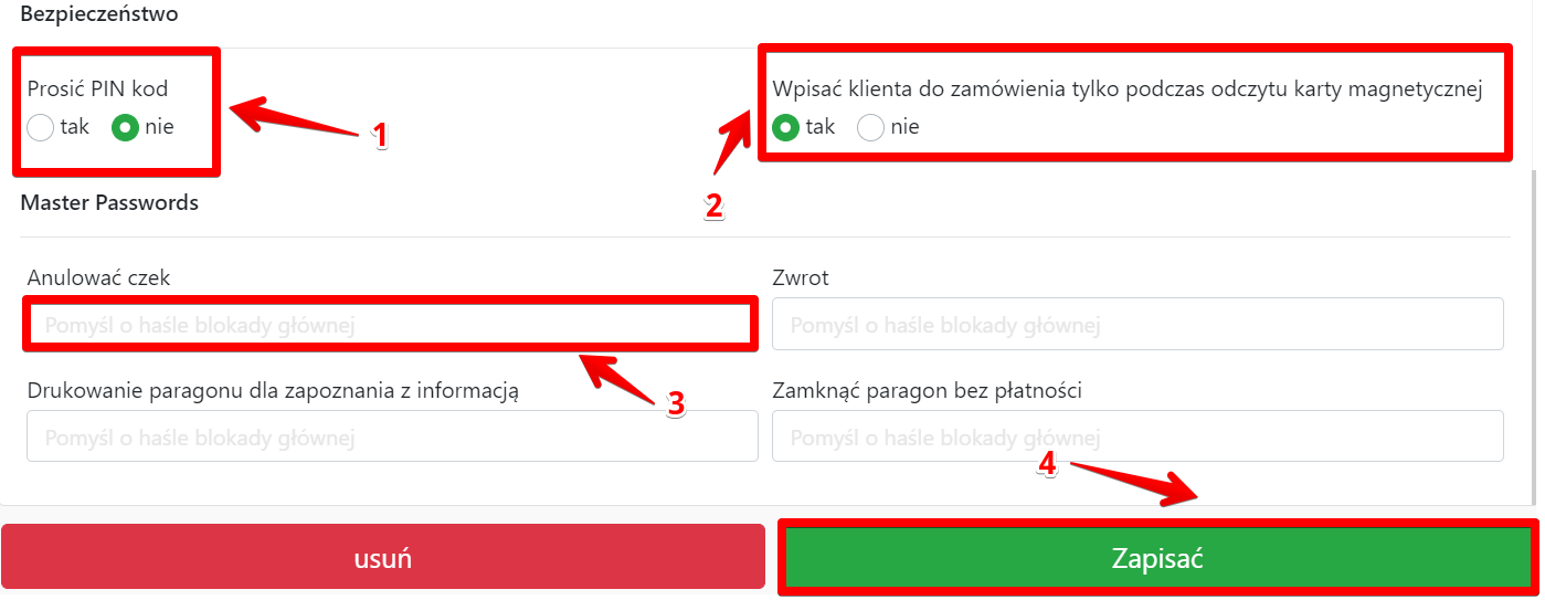 Przy tych ustawieniach pracownik nie będzie mógł „anulować czeku”, „zrobić zwrot, „wydrukować poprzedni paragon” ani „zamknąć paragonu bez płatności”