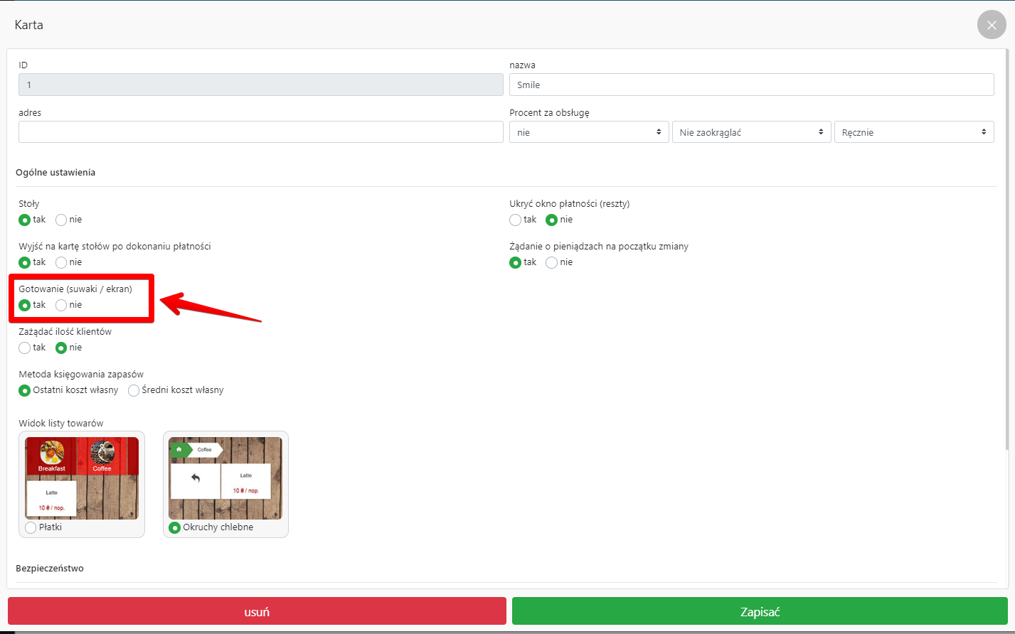- W Gotowanie (suwaki / ekran) kliknij Tak