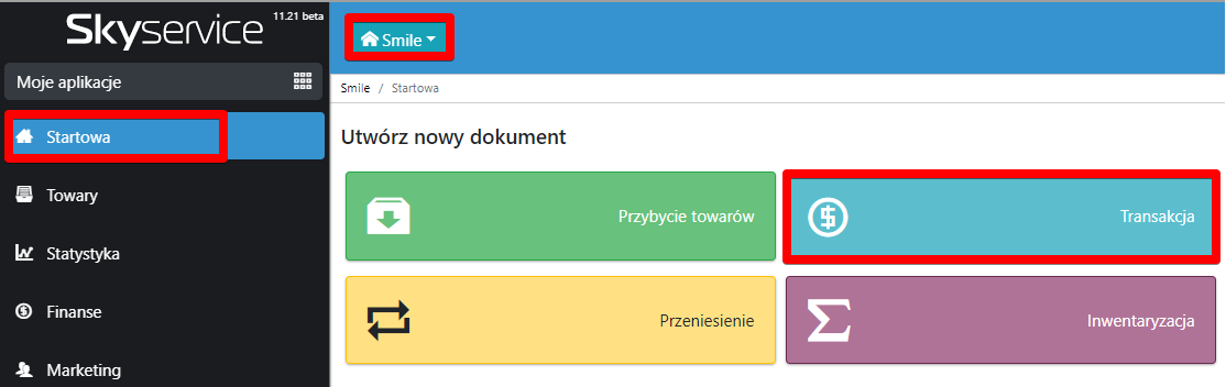 - W panelu administracyjnym wybierz żądane punkt sprzedaży(jeśli masz kilka), przejdź do sekcji Startowa – Transakcji