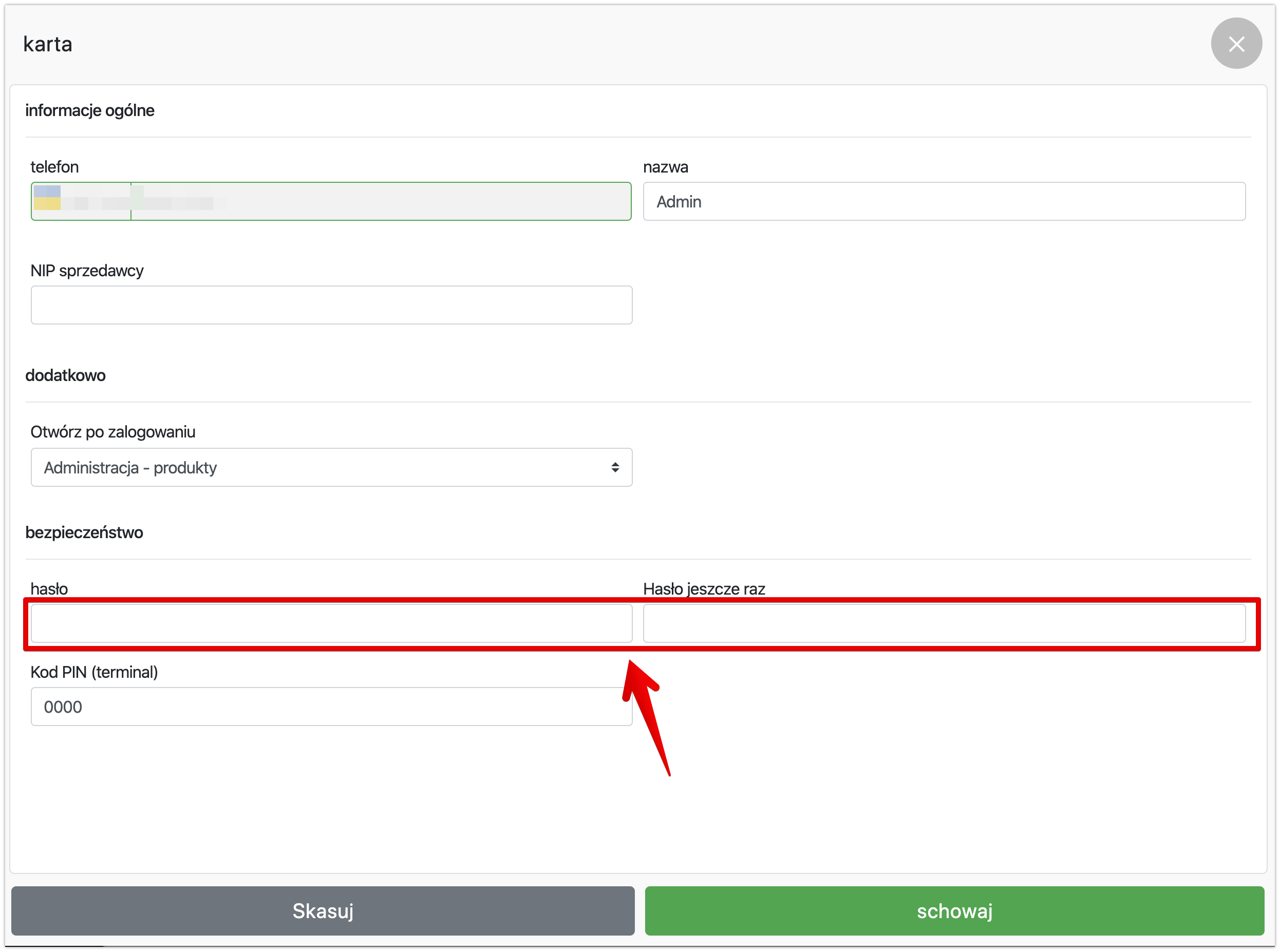Aby znaleźć lub zmienić hasło dostępu do terminala, w panelu administracyjnym przejdź do karty Ustawienia → Pracownicy → Wybierz pracownika → Edytuj hasło lub PIN