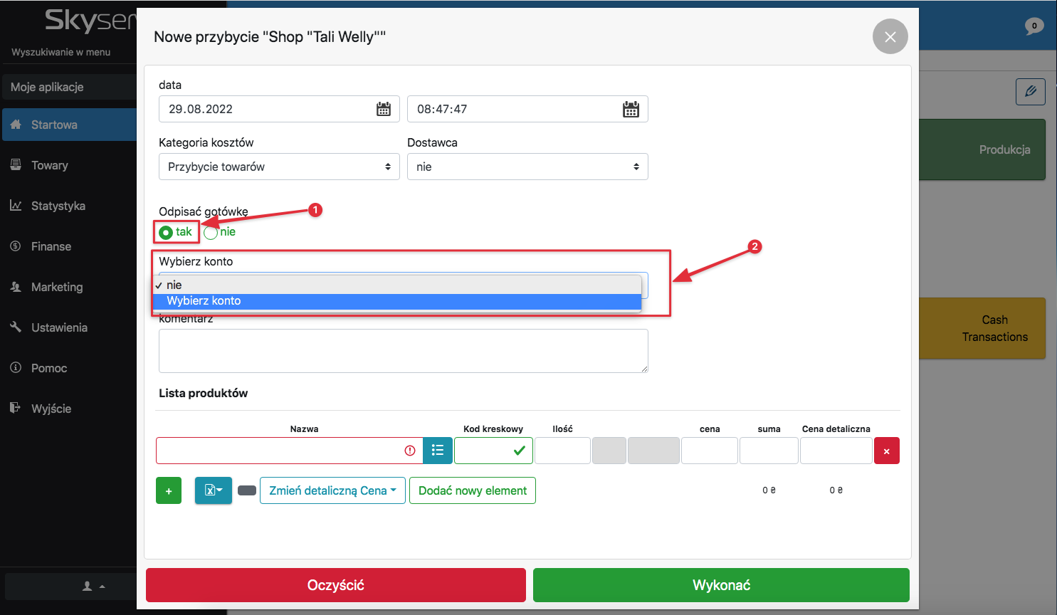 - W oknie, które się otworzy, wybierz “Tak” w pozycji “Odpisać gotówkę”