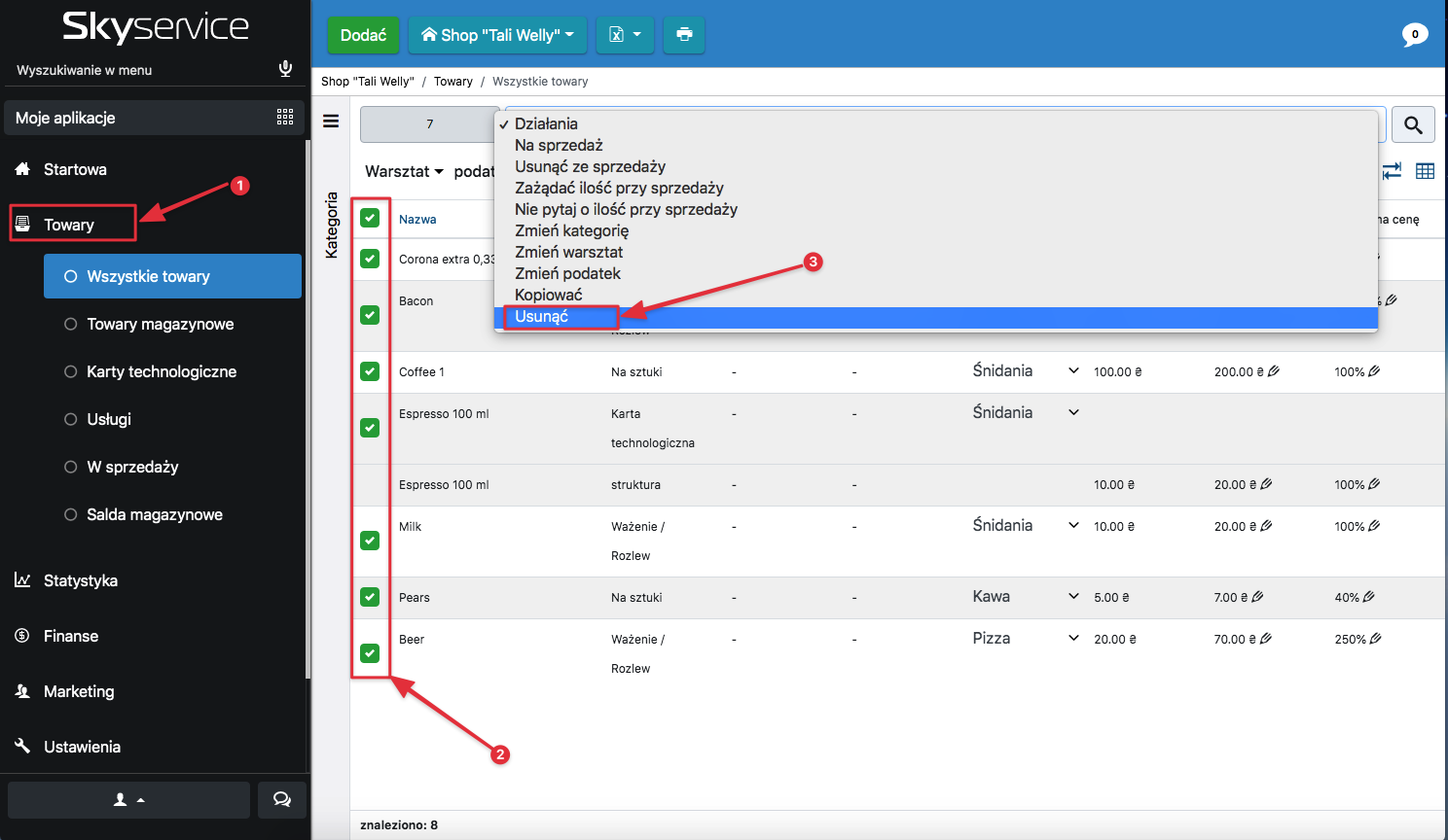 - W panelu administracyjnym otwórz sekcję “Produkty” – “Wszystkie towary”