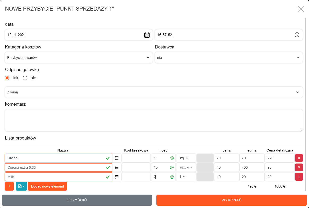 Wpisujesz : nazwę produktu, kod kreskowy (opcjonalnie), ilość, cenę.
