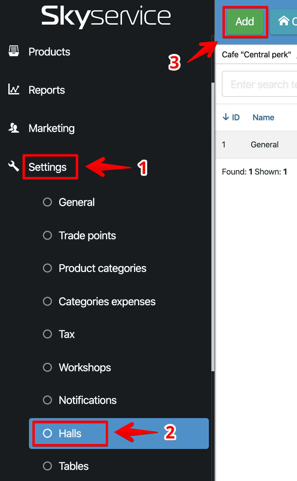 Adăugarea de săli Puteți adăuga locația sălilor în panoul de administrare : Accesați fila Setări → Hale și faceți clic pe Adăugați Introduceți Numele și faceți clic pe Adăugați Read more: Related lessons Cum se schimbă limba și moneda în SkyService Setarea timpului Multiterminal Perioada de creditare Cum să creați un cont Popular Lessons Cum să faci rapoarte X și Z FAQ | Questions and answers Înregistrare Cum să adăugați un angajat (drepturi de acces, acces la depozite) Cum să adăugați un produs (piesa)