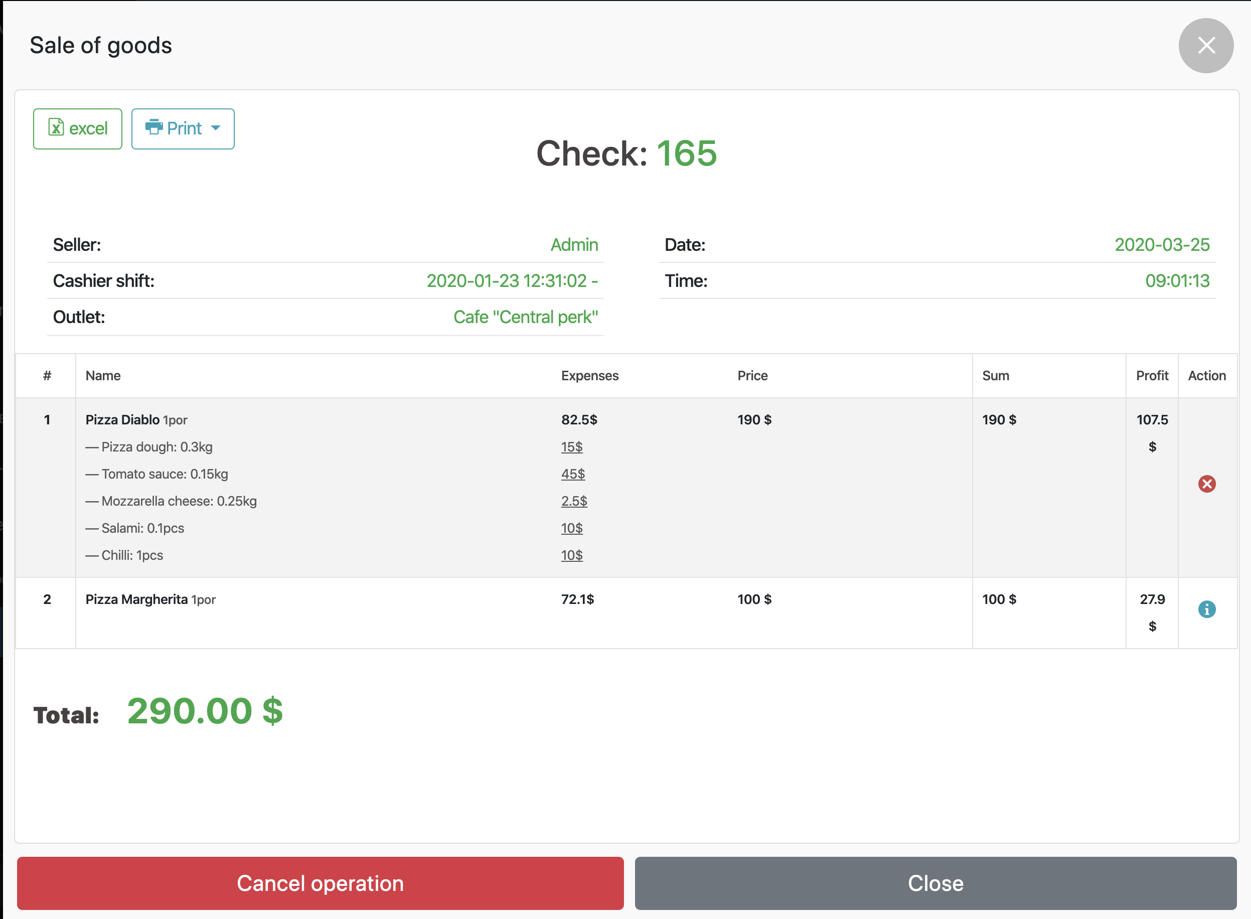 - Făcând clic pe poziția din top vânzări veți vedea o listă de chitanțe cu bunuri vândute pentru perioada selectată anterior, puți :
