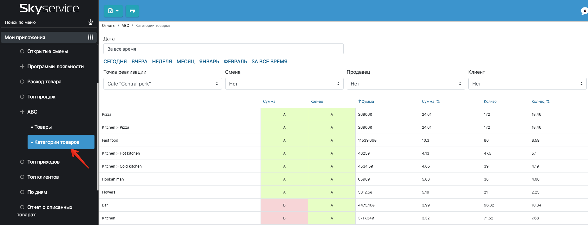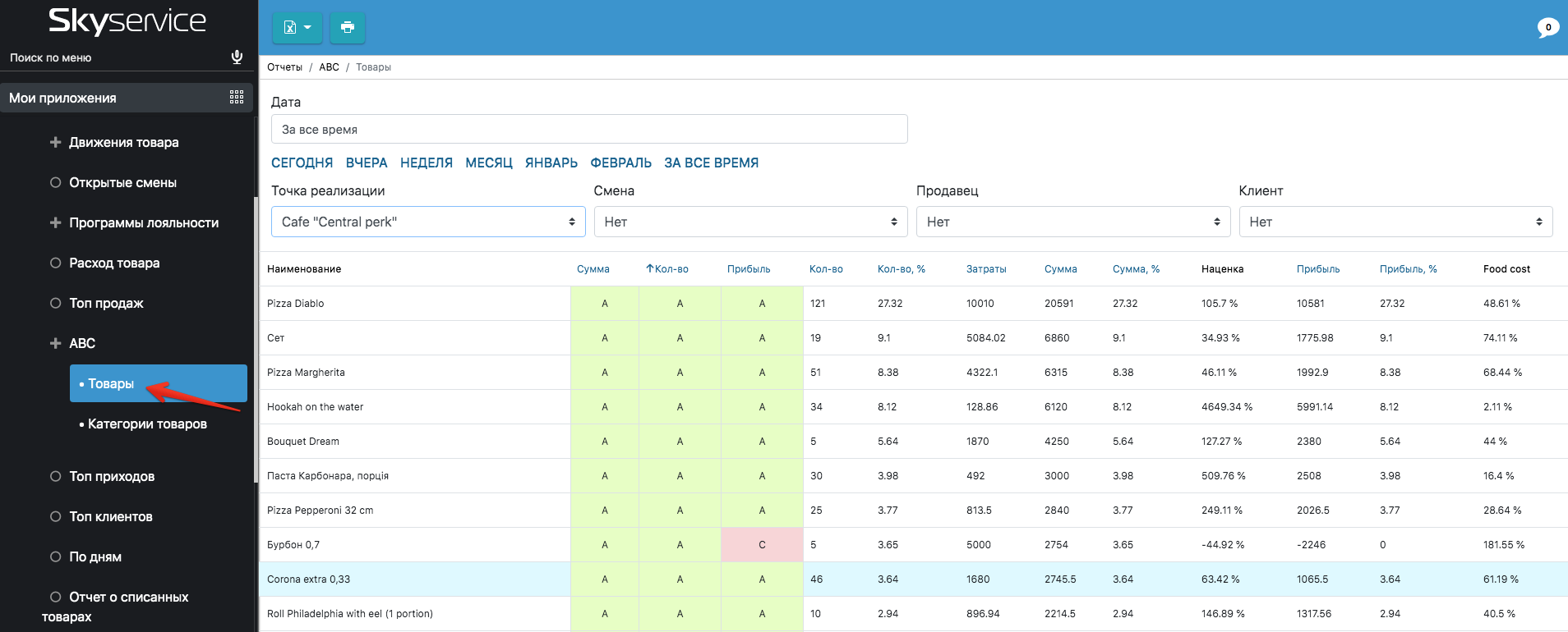 В SkyService POS вы можете провести ABC-анализ: