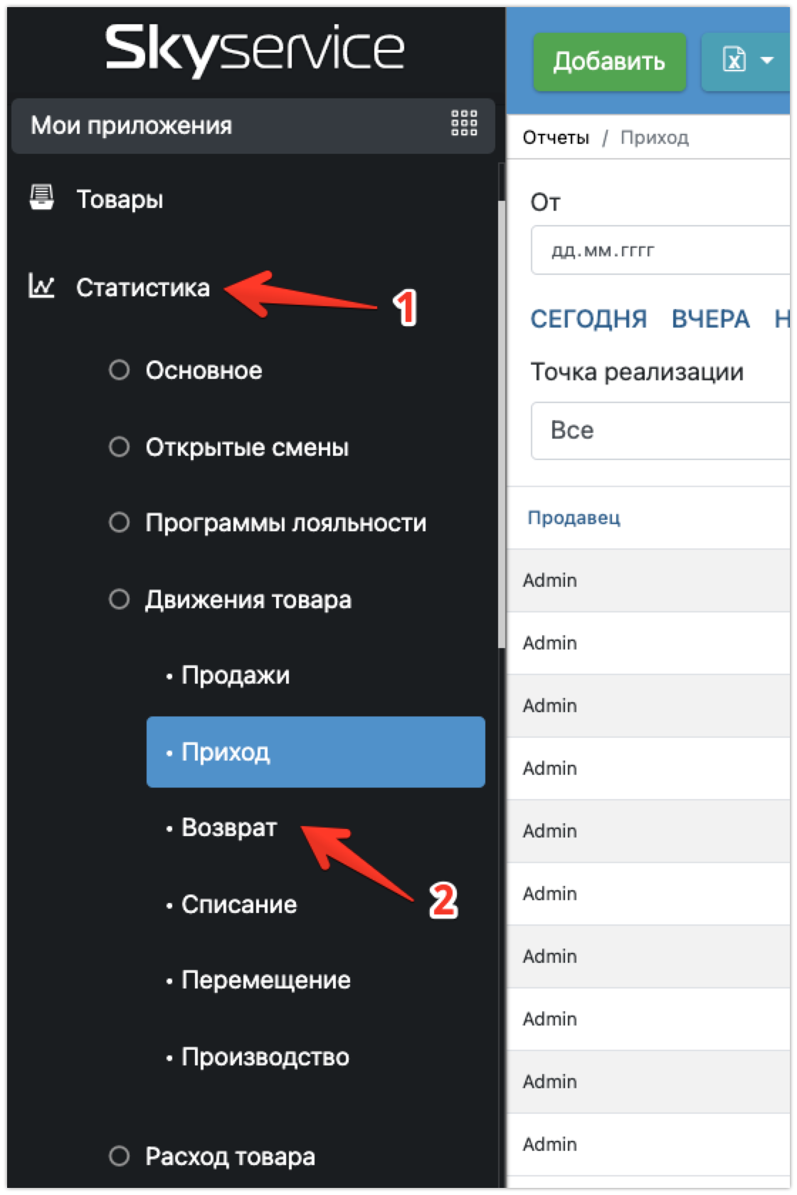 - В Админ-панели перейдите в раздел Статистика – движения товара;
