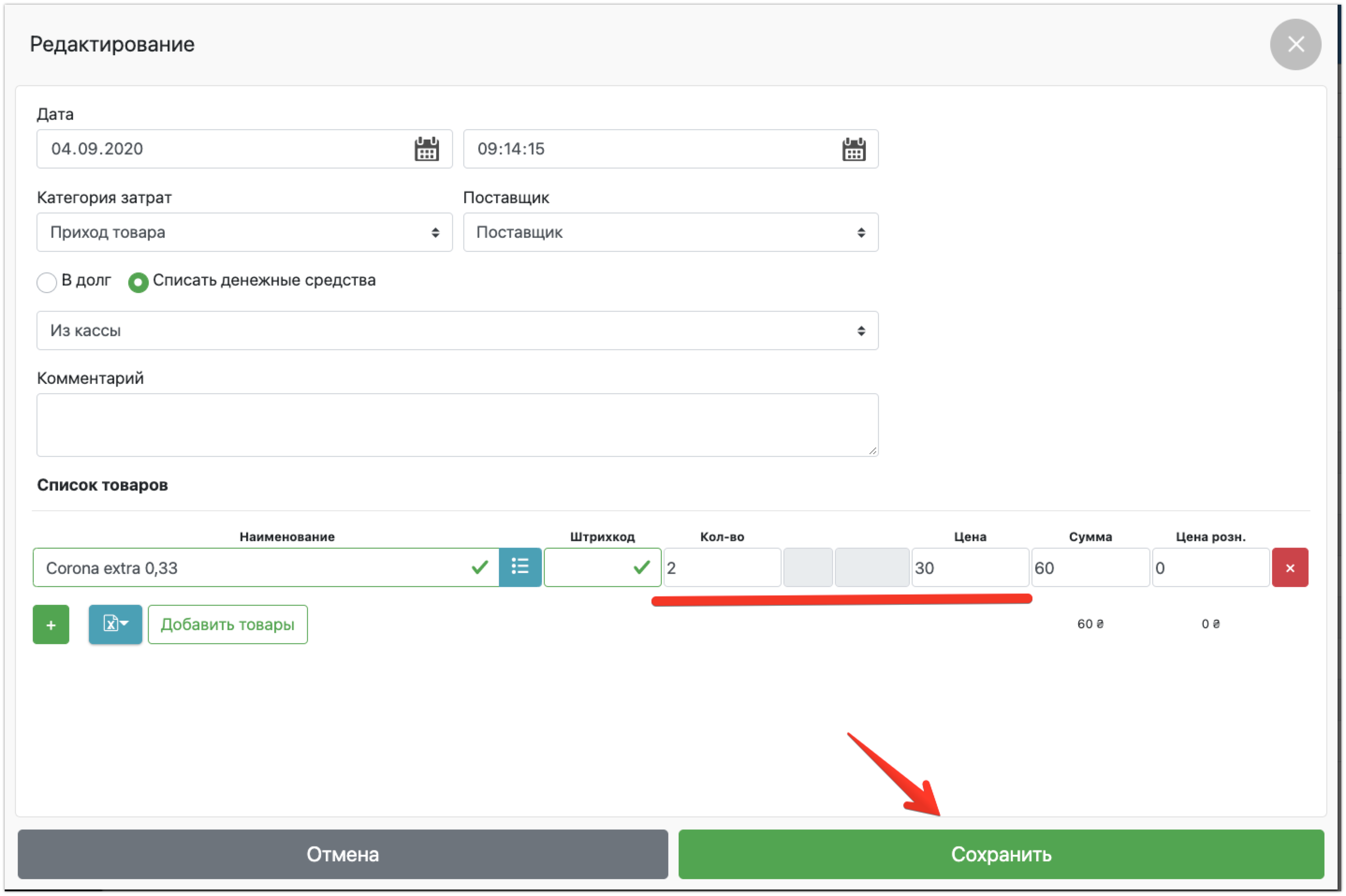- Приход товара;