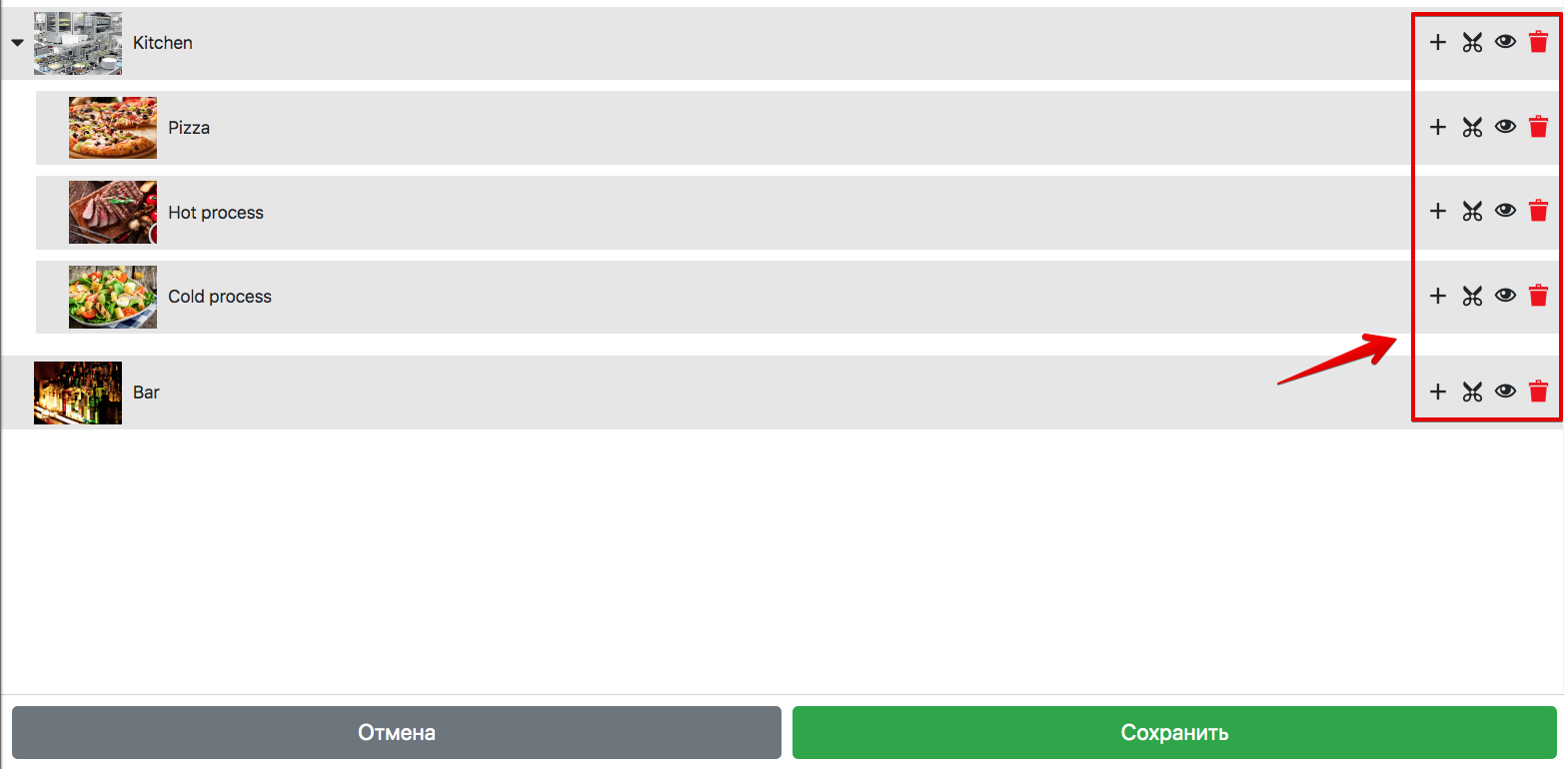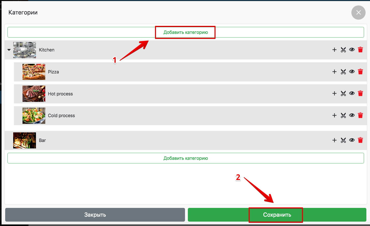 - Кнопка «Глаз» — скрывает отображение категории в пос-терминале
