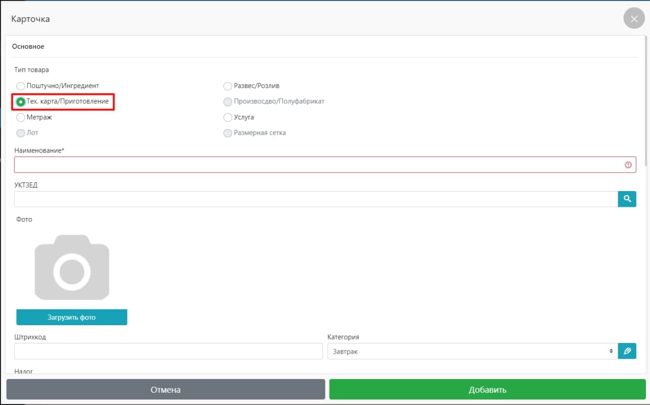 Добавление Калькуляций/Технологических карт (по необходимости)