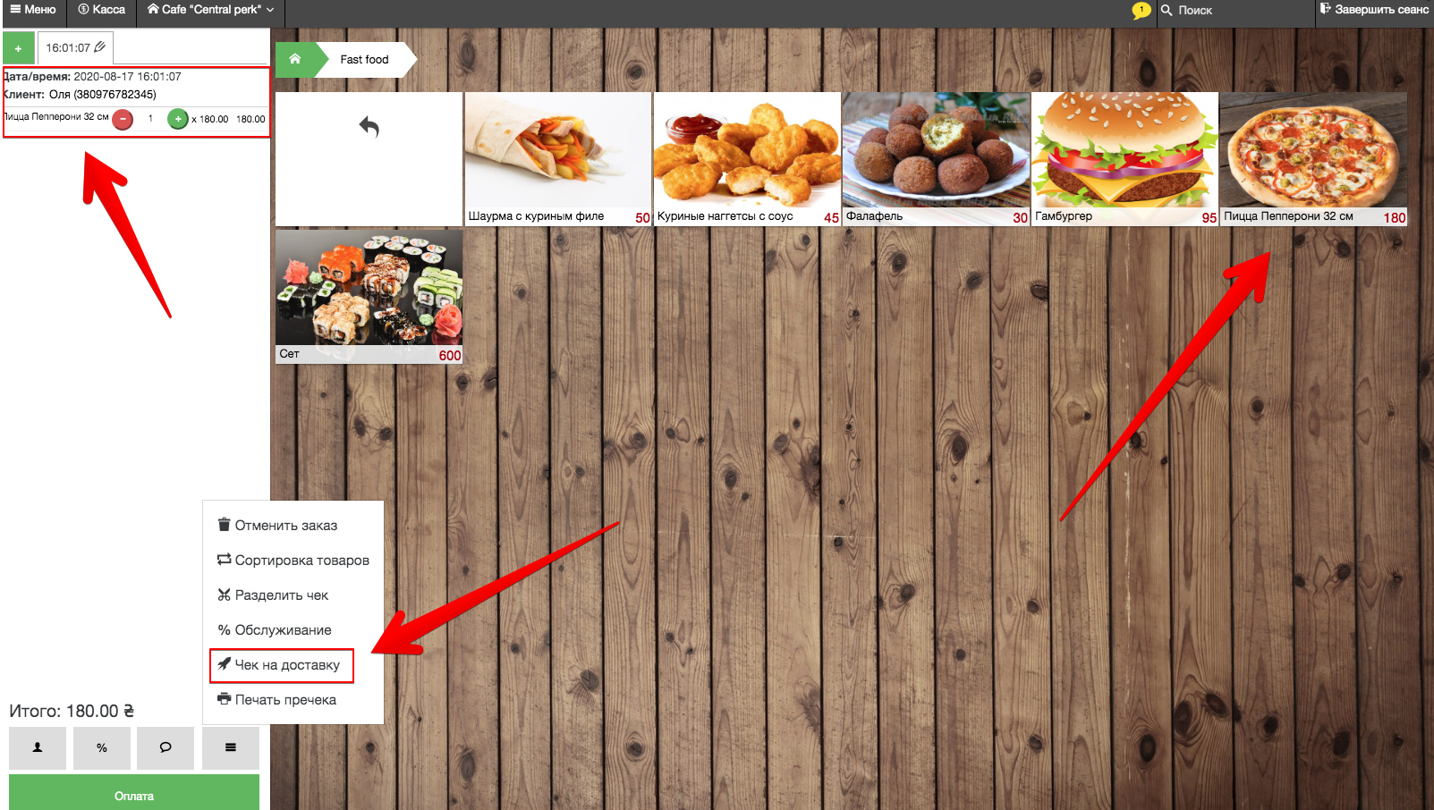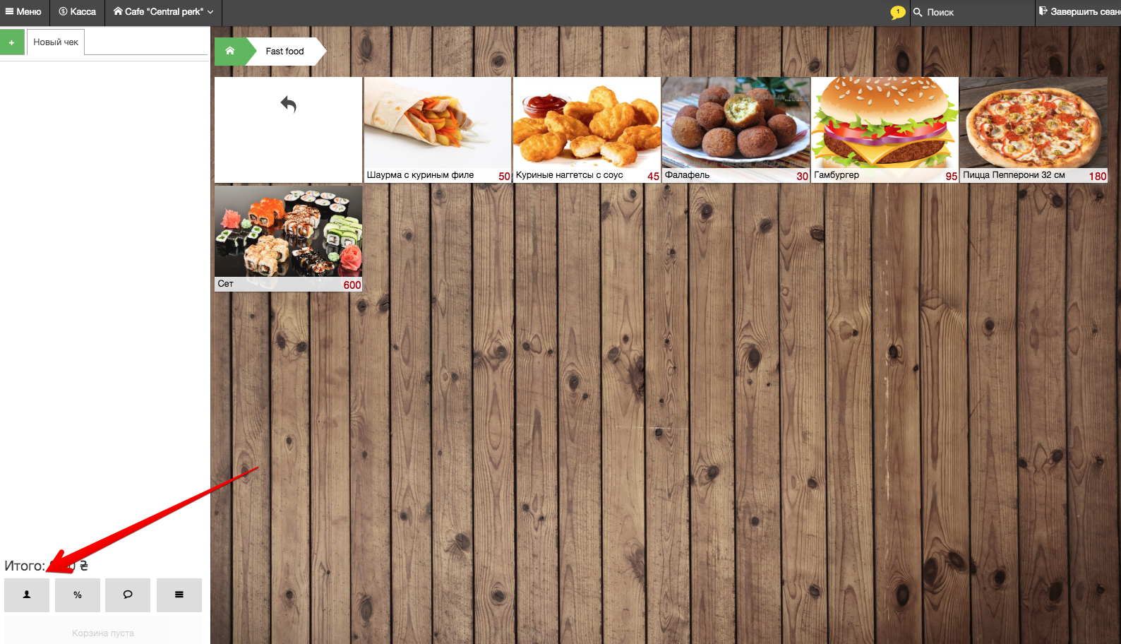 - В Pos-терминале в панели оформления заказа, под Итоговой суммой нажимаем на кнопку –