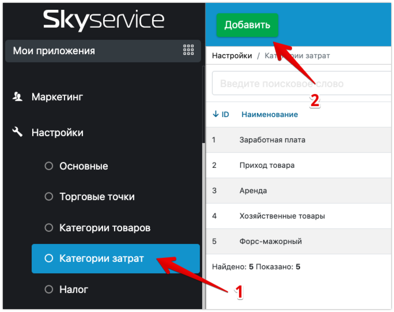 Как создать категорию расхода В Админ-панели перейдите в раздел Настройки – Категории затрат, нажмите Добавить Введите Наименование Выберете тип расхода: Инвестиция; Регулярные платежи; Разовый. Нажмите Добавить ☝🏼 Расход – заработная плата, приход товара, аренда Прочитайте еще: Уроки по теме Как изменить язык и валюту в SkyService Настройка времени Мультитерминал Кредитный период Как создать счет Популярные уроки Программный РРО | Как начать работу Настройка принтера Xprinter Как сделать X- и Z-отчеты Настройка принтера Pos Sector Как настроить чековый принтер на Windows