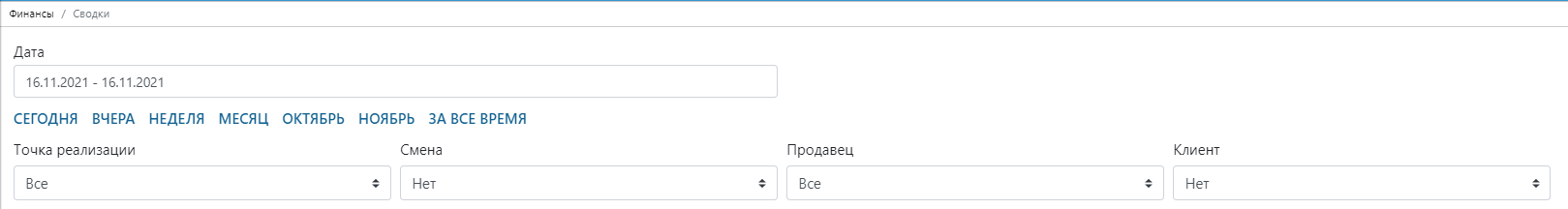 В верхней части страницы можете выбрать нужные вам фильтры отчетности: