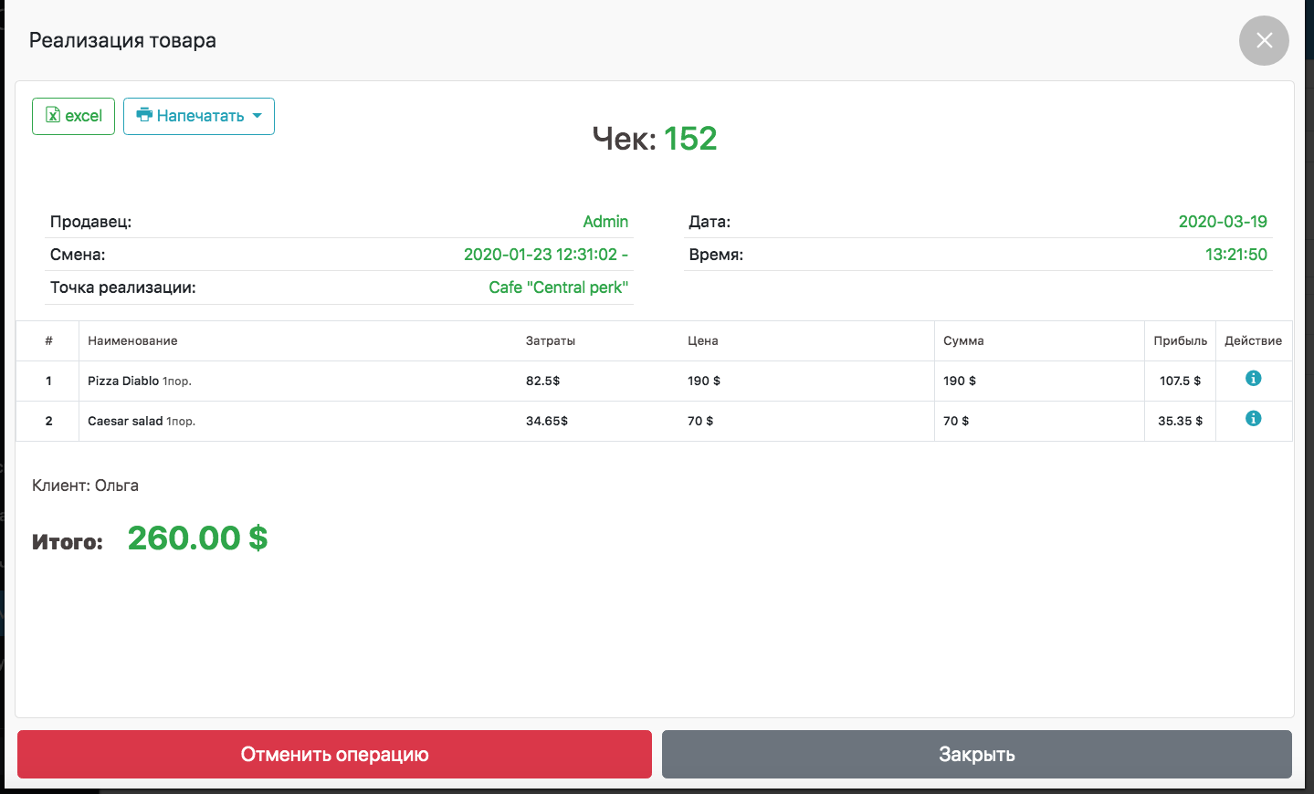 - Кликнув по позиции в топ-продажах вы увидите список чеков с проданным товаров за выбранный ранее период, вы можете: