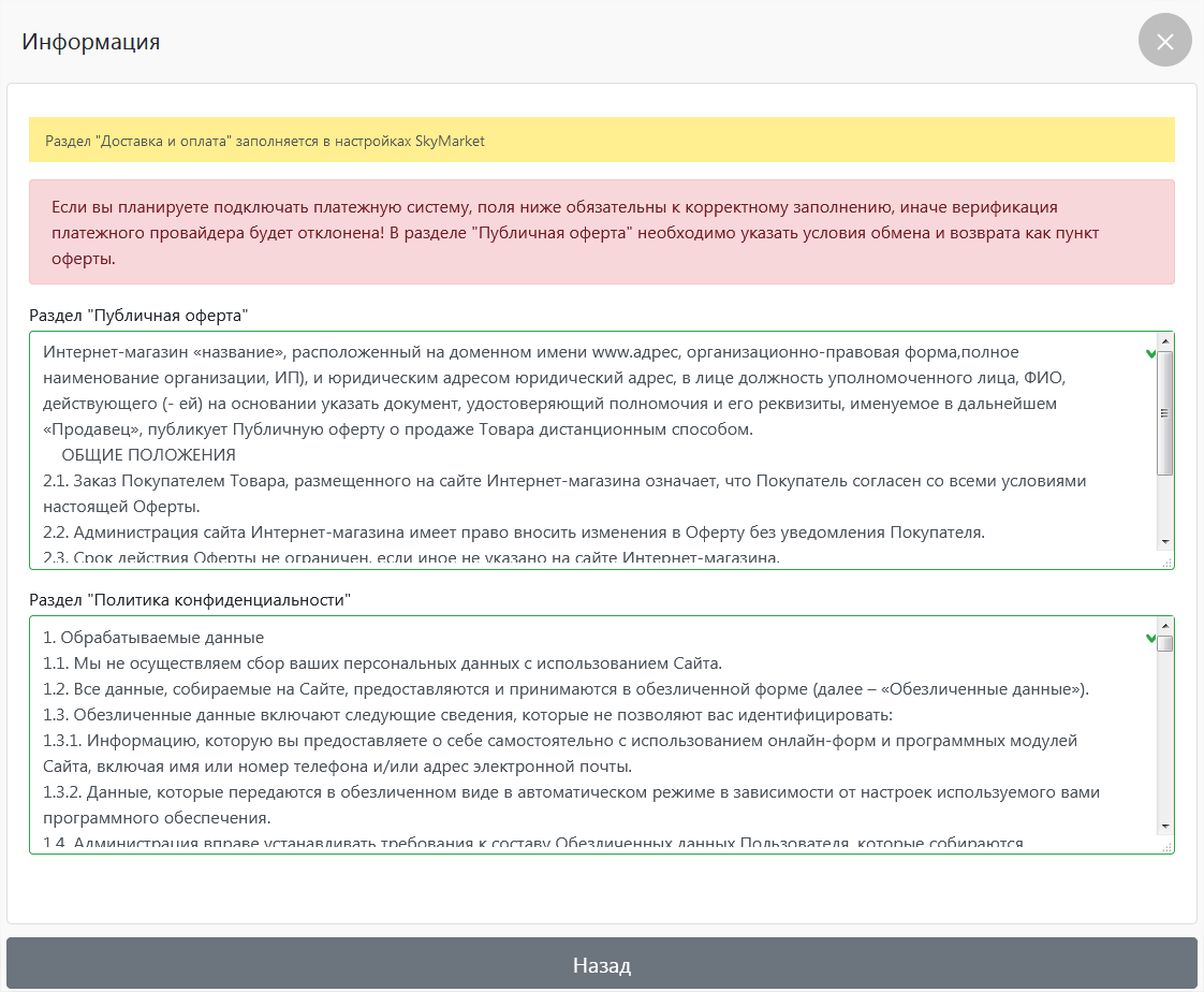 - Если вы не заполните одну из страниц, онлайн оплата картой будет недоступна