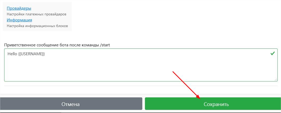 - В конце запишите приветствие клиентов вашим ботом после команды /start