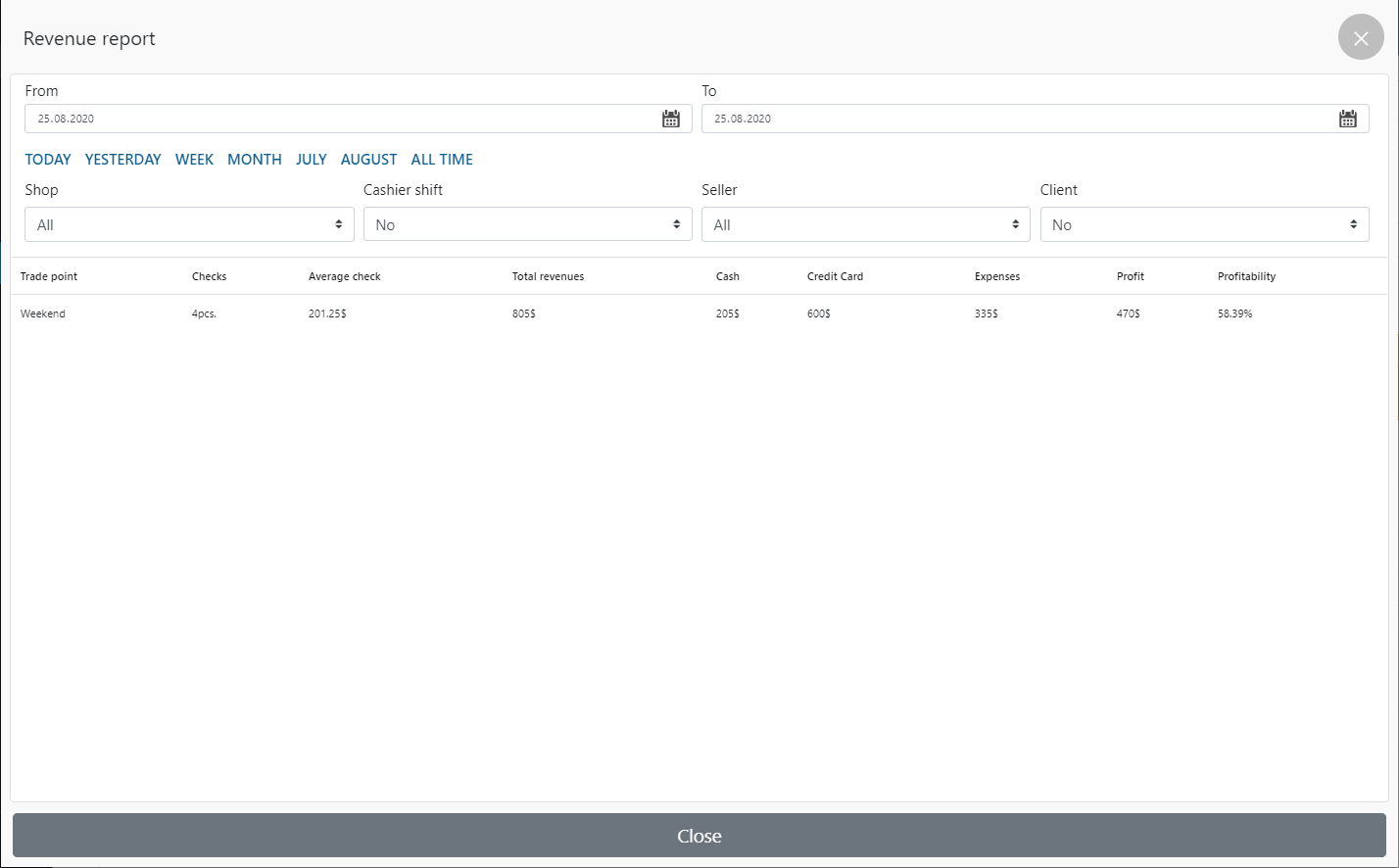 - Birkaç satış yeriniz varsa, gelirlerini grafikte veya “Daha fazla oku ..” seçeneğini tıklayarak görüntüleyebilir ve aşağıdaki verilerle daha ayrıntılı bir rapor görüntüleyebilirsiniz: