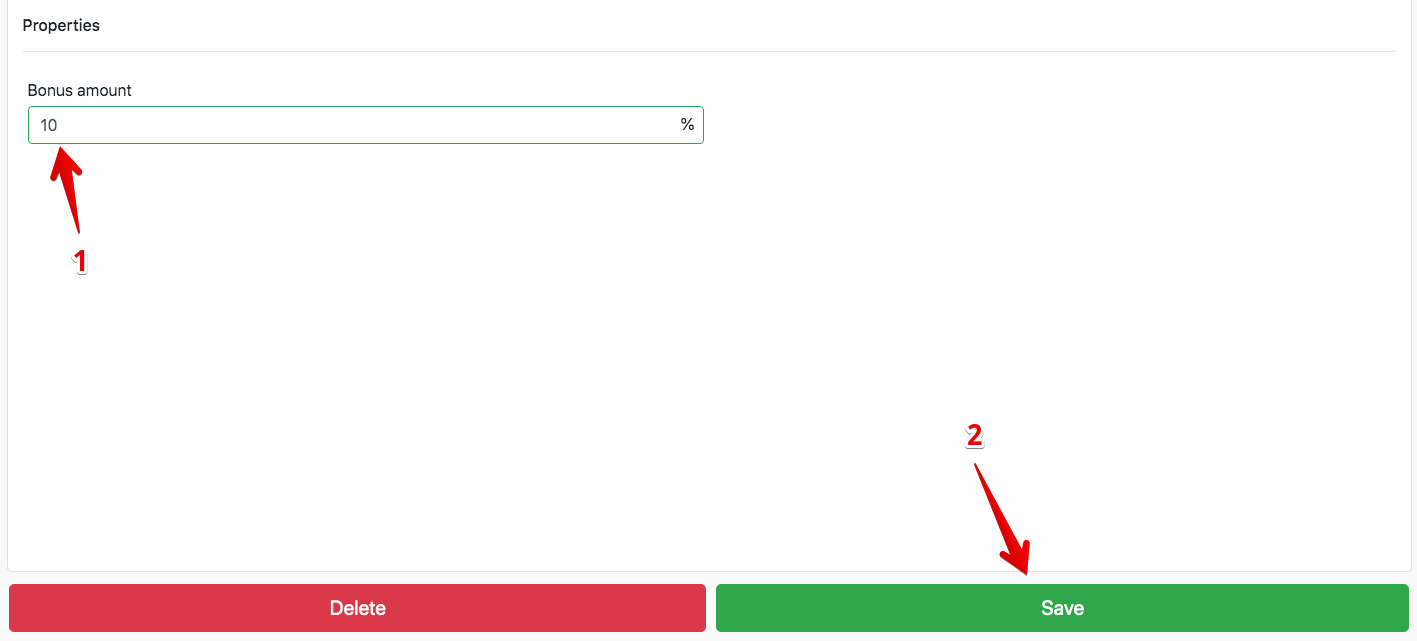 - “Parametreler” bloğunda, Bonus boyutu alanına bonus yüzdesini girin (çekin bu yüzdesi müşteri tarafından bonus bakiyesinde alınacaktır)