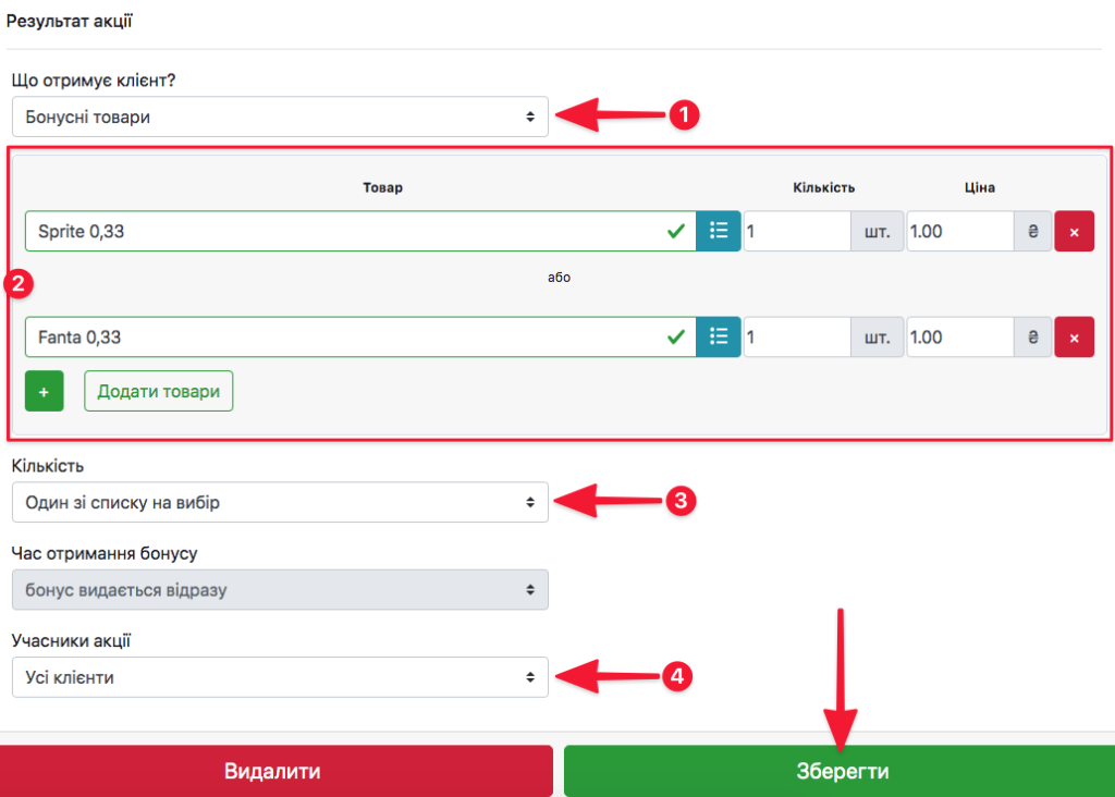 - Виберіть що отримує клієнт (бонусні товари, фіксовану ціну зі знижкою на кожен акційний товар, відсоток знижки на акційні товари)