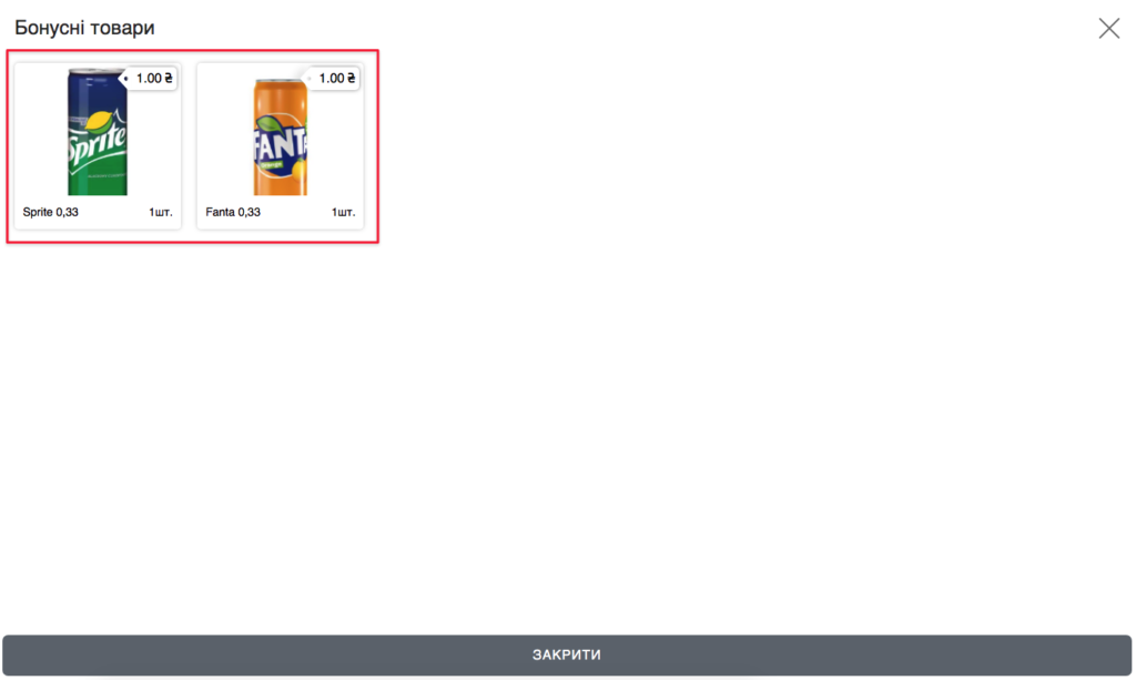 - З’явиться вікно з вибором бонусного товару (у випадку, якщо у вас було виставлено Один зі списку на вибір і в списку бонусних товарів додано більше ніж 1 позиція)