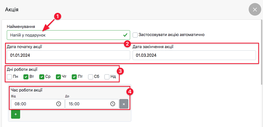 - Введіть час роботи акції