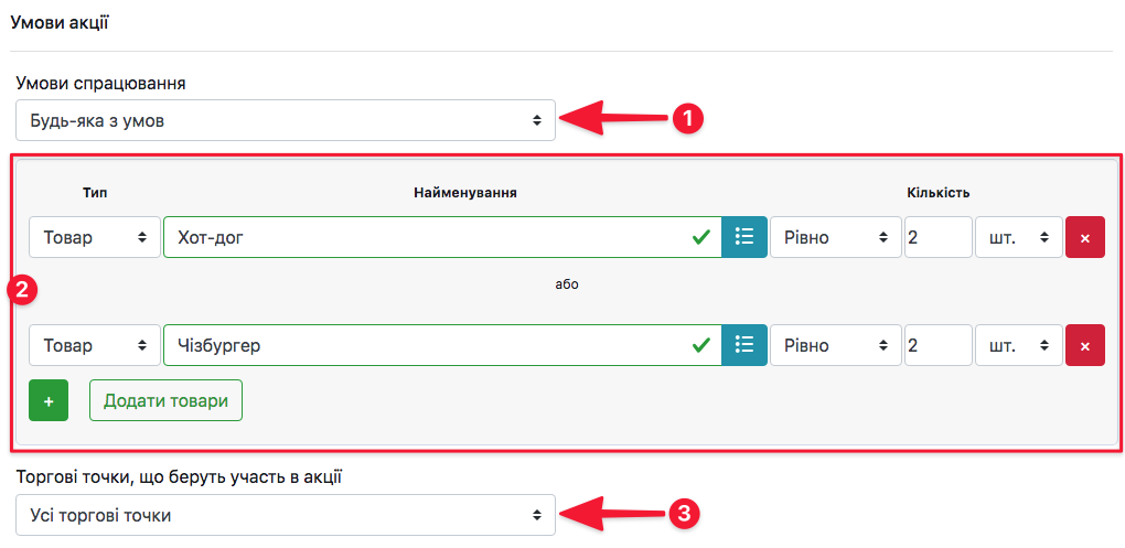 ❗️ Приклад нижче вказаний для умови спрацювання акції “Будь-яка з умов”.